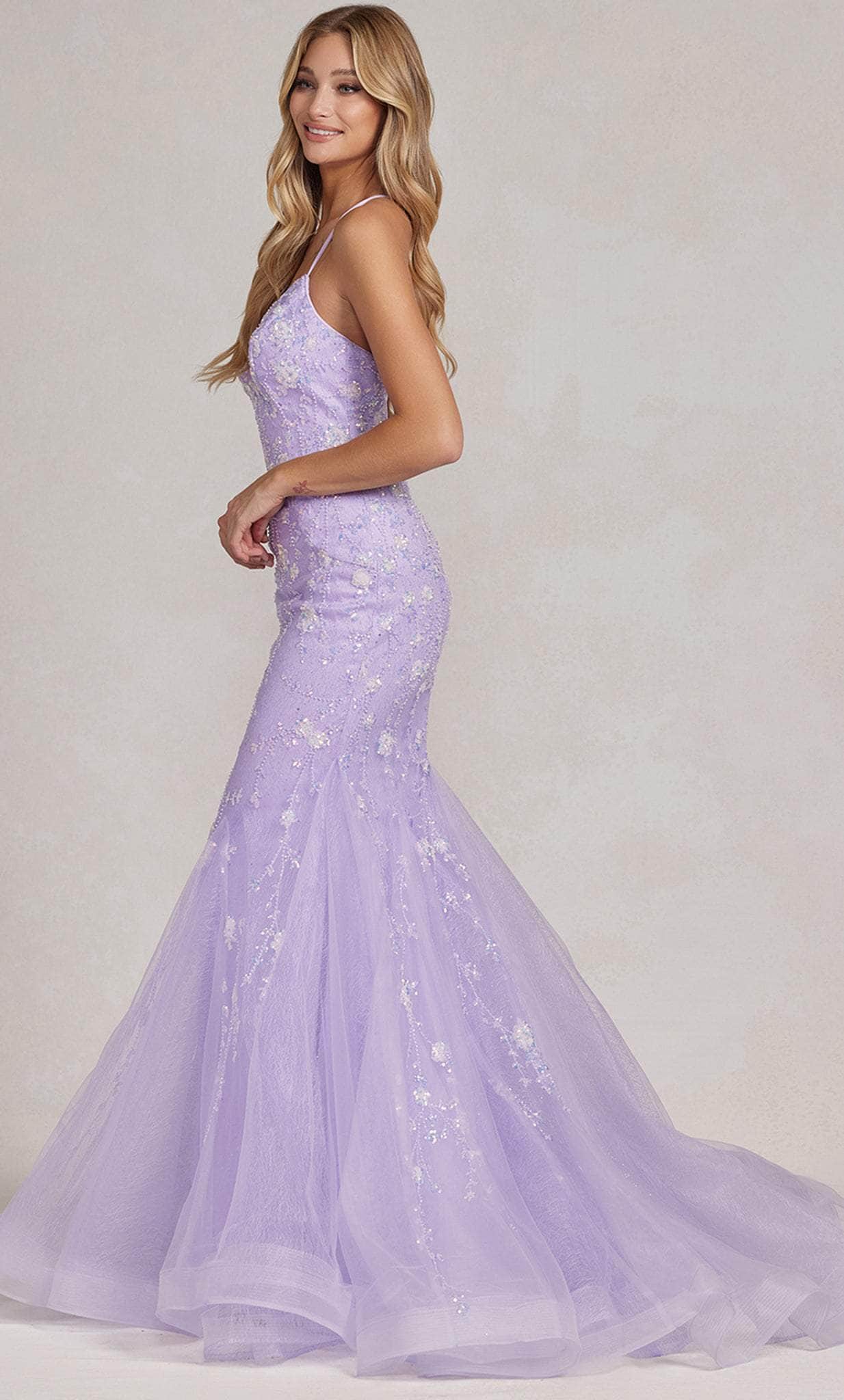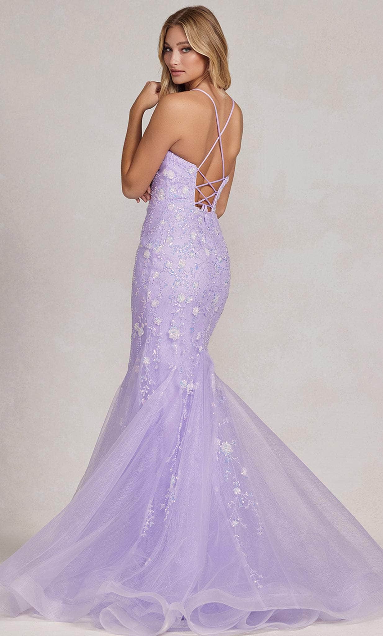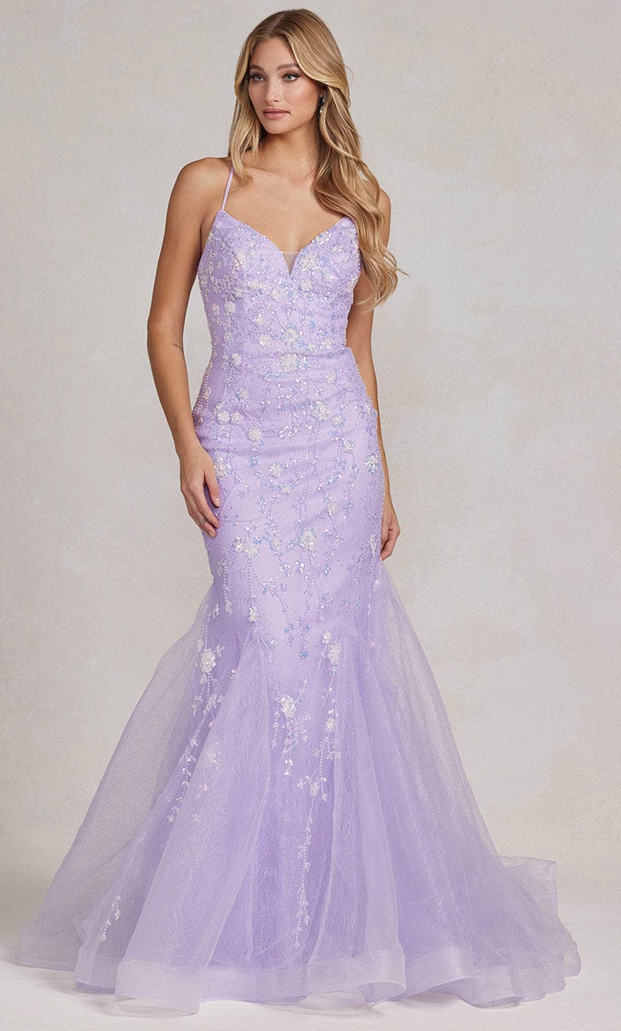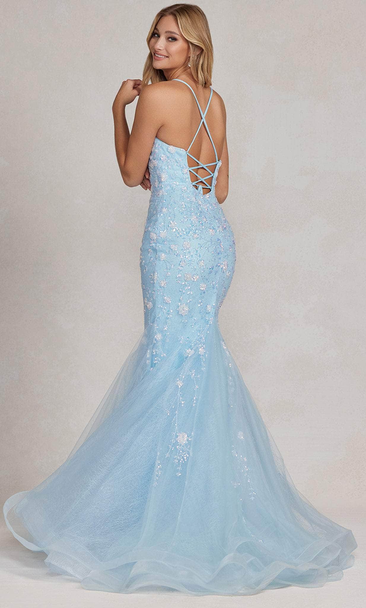 Enter the hall with grace and beauty in Nox Anabel C1117 masterpiece. The sleeveless gown is decorated with sequin floral appliques and beadwork throughout the silhouette. It features a deep v-neckline, spaghetti straps, and an open lace-up back. The skirt has a captivating godets accent to create a trumpet silhouette and finishes with a spill of sweep train. Feel dainty and feminine in this enchantingly designed Nox Anabel C1117 gown. Models are wearing the Black Multi, White Multi, Lilac, and Sky Blue colors.