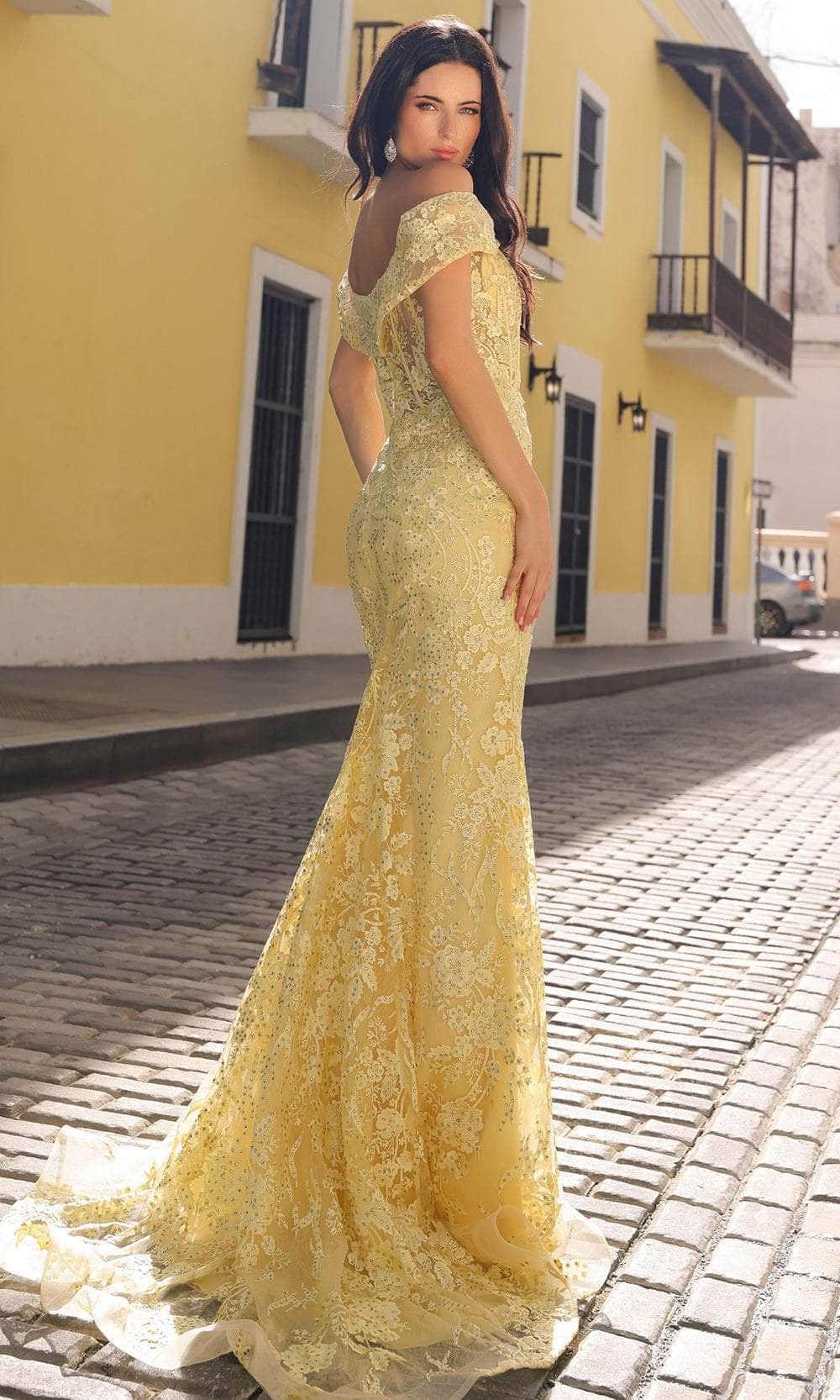 Claim your spot as the darling of the party with this creation by Nox Anabel C1455. Creatively adorned with floral embroidery and sprinkled beads, this fitted dress is the epitome of glamour. It displays a fold-over detail on the off shoulder v-neckline, cap sleeves, and mid-open back. The thigh-high leg slit creates a daring yet classy look. The sheath skirt strikingly enhances your figure, completed with a horsehair hem and sweeping train that brings drama. This Nox Anabel C1455 dress is perfect for a standout style and flawless fit. Models are wearing Black&Nude, Candy Pink, and Lemon colors.