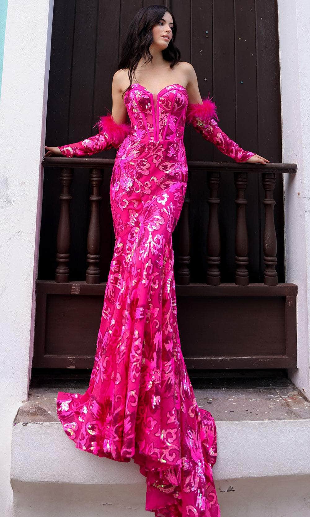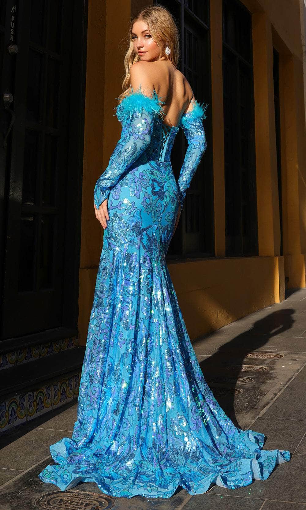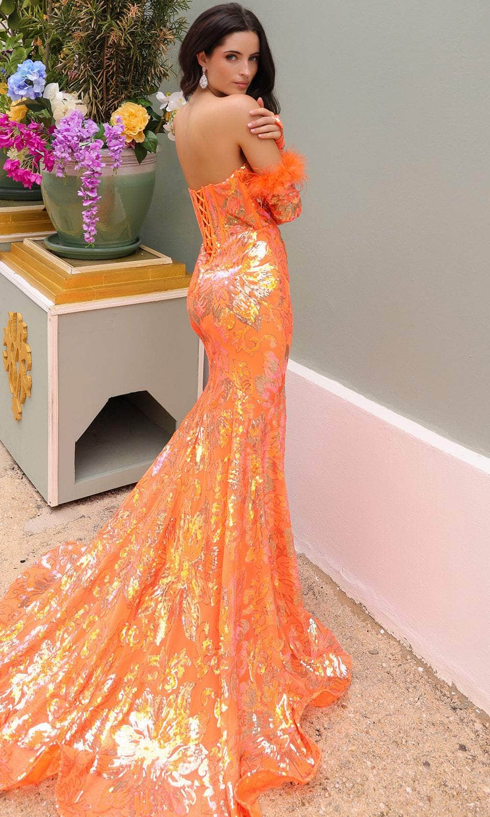 Indulge in the epitome of romantic allure with the exquisite design of this Nox Anabel D1269 gown. A sweetheart neckline, enhanced by corset boning, graces the bodice, creating a sculpted and flattering silhouette. The plunging inset adorned with opulent sequins adds a touch of luxury and drama, while the lace-up back ensures a perfect fit. The mermaid skirt, featuring a high slit and a sweeping train, exudes elegance and allure. Completing the ensemble are feather gauntlet sleeves, adding a whimsical and enchanting touch to this Nox Anabel D1269 masterpiece that promises to make you the star of any occasion. Models are wearing the Fuchsia, Orange, Turquoise, White/Multi, and Emerald colors.
