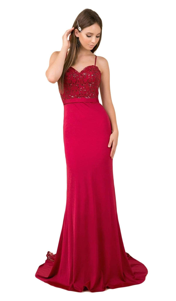 | Details: | Sequined Lace, Spaghetti Straps, Mid-Open Back, Back Zipper Closure, Waistband, Sequined Applique Illusion Panel, Sweep Train |