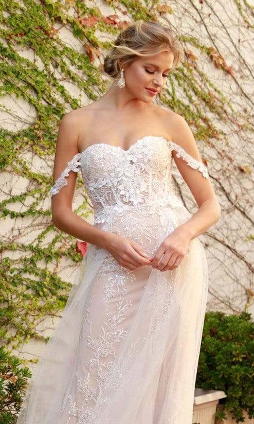 Make an utterly romantic style on your wedding day in this Nox Anabel E441 creation. Structured with corset boning and embellished with ornate lace appliques, this gown has an off shoulder neckline with a sweetheart bodice, The sheer back leads to a fantastic flow of overskirt that cascades to a train. The sheath skirt parts with a stunning high slit. Exude a vintage bohemian style on your day in this Nox Anabel masterpiece.
