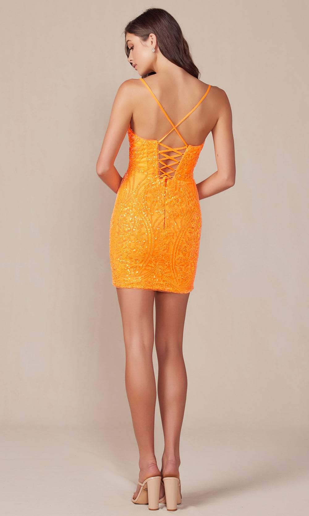 You will definitely make a statement in every occasion when you wear this Nox Anabel E897 cocktail dress. This creation showcases an alluring plunging sweetheart neckline on a fitted and sleeveless bodice, also featuring a sheer inset as well as spaghetti straps for added support. The back is mid-open and is styled in a crisscross manner, enclosed by a lace for a graceful finish. Additionally, this is dress is entirely designed with floral sequin embellishments, allowing you to bloom with loveliness while looking extra dazzling on your special night. It also reveals a sheath silhouette which adds to the overall sophistication of your look. This Nox Anabel E897 masterpiece will absolutely make you feel special! Models are wearing Black, Fuchsia, Orange, and Turquoise colors.