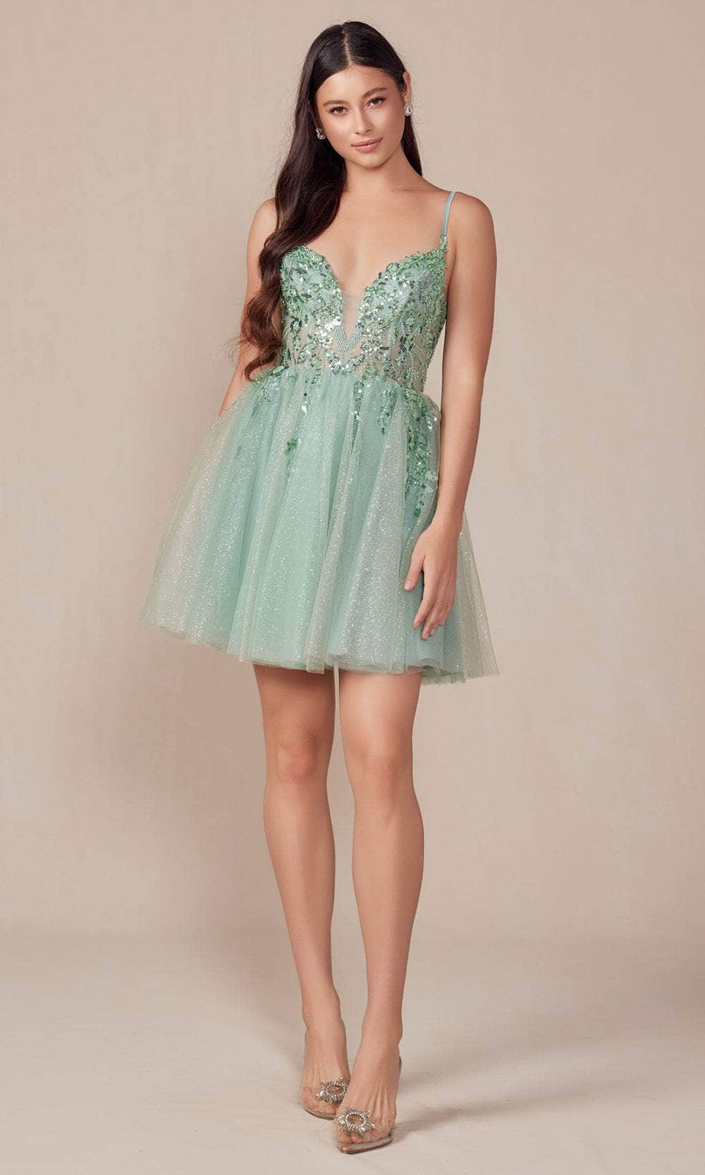 Make it your night worth reminiscing in this captivating Nox Anabel E902 cocktail dress. You will surely be on the spotlight as you wear this dress, featuring an alluring plunging sweetheart neckline on a fitted bodice, also complemented by thin straps for added support. The mid-open back, which is secured by a lace for a graceful finish, also displays a crisscross style. The top showcases endearing floral embroidery and sequin designs, while the A-line skirt mesmerizes onlookers with its glittery effects. Look lovely in this timeless Nox Anabel E902 masterpiece. Models are wearing Royal Blue, and Sage Green colors.