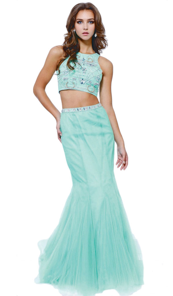 Steal the show in this dazzling two-piece Nox Anabel 8156 evening gown . Fashioned in flattering silhouette, this gown features a V-neck sleeveless tank bodice decked with beaded embellishment. Bare at midriff, the skirt's waistline is embellished with jewel stone as it draws a fitted figure through the hips. Flirty tulle godets run around the knee portraying the mermaid hem and graciously falls down to full length. This evening dress ensemble is designed with sophistication in mind, it is your perfect choice for prom, pageant or any special event.