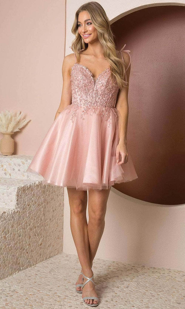 Show off your bubbly and pleasant personality with this short dress by Nox Anabel F732. Intricately detailed with shimmering beads, this dress flourishes a deep sweetheart neckline with an illusion inset and can be tied up by thin shoulder straps. Structured with corset boning, the back offers a mid-open back and held with a zipper closure while the glittered A-line skirt cascades in short hemline. Lavish yourself in sheer sophistication in this Nox Anabel masterpiece. Models are wearing Blush, Silver, Champagne and White colors.