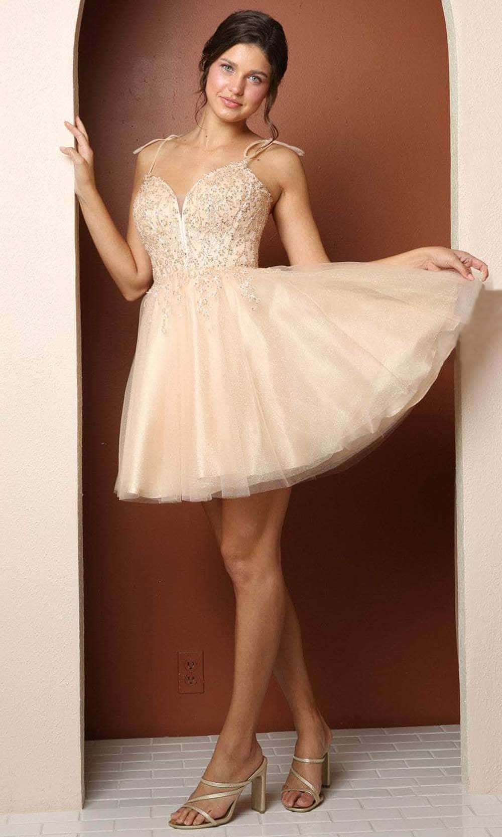 Intricately detailed with shimmering beads, this dress flourishes a deep sweetheart neckline with an illusion inset and can be tied up by thin shoulder straps. Structured with corset boning, the back offers a mid-open back and held with a zipper closure while the glittered A-line skirt cascades in short hemline. Models are wearing the Blush, Champagne Silver and White colors.