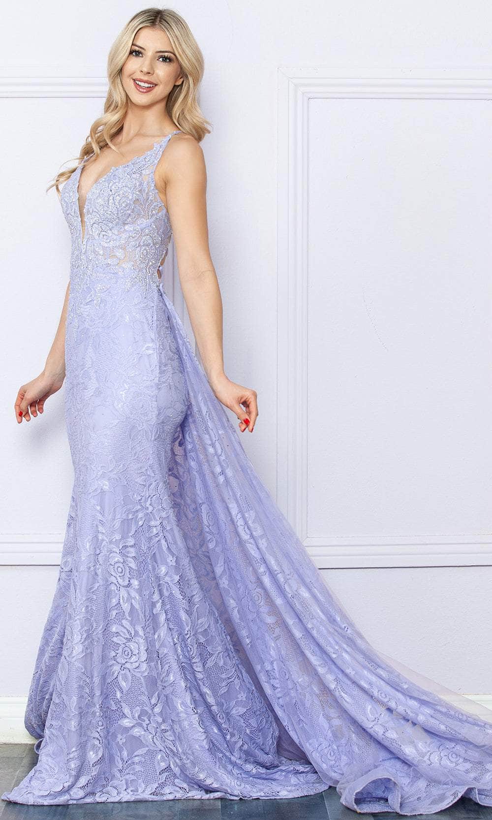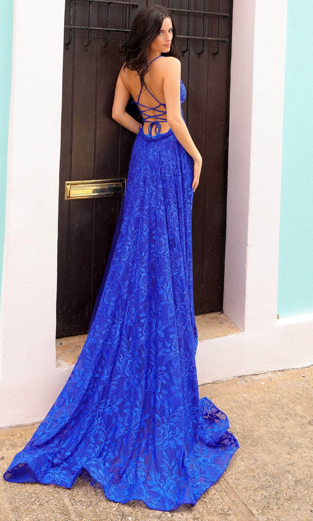 Reveal your inner diva with flair in this beautifully crafted Nox Anabel G1353 creation, where masterful tailoring details adorn a sculpted lace silhouette. A sleeveless bodice and a sensuous plunging v-neckline create a harmonious balance of contemporary chic and classic sophistication. The gown transcends ordinary beauty with embellishments of intricate jewels and delicately embroidered lace, ensuring a mesmerizing presence. The drama unfolds at the back, where an open design intricately weaves with a lace-up pattern, leading to a mermaid skirt that cascades into a captivating long train and flowing back panel. Exude sheer opulence in the resplendent Nox Anabel G1353 masterpiece. Models are wearing the Forest Green, Periwinkle, and Royal Blue colors.