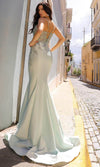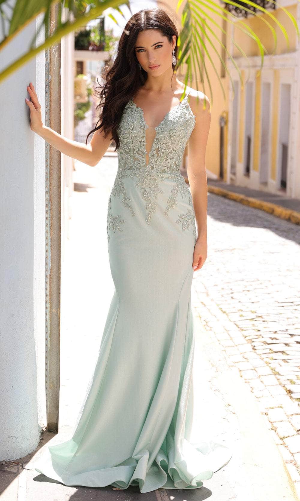 Trail a mesmerized audience along the red carpet as you exude sophistication and allure in this resplendent Nox Anabel G1364 creation featuring meticulous tailoring details on a sculpted silhouette. Adorned with delicate spaghetti straps that trail gracefully to a bodice, this gown commands attention with a plunging v-neckline enhanced by an ethereal illusion inset. The ensemble is a symphony of opulence, as intricate jewels and embroidered lace details embellish every inch. The allure continues with a daringly open back, intricately weaved with a lace-up design. The skirt unfurls into a mesmerizing mermaid design, culminating in a regal long train, making this Nox Anabel G1364 ensemble a masterpiece of refined elegance. Models are wearing the Apricot Rose, Plum, and Sage Green colors.