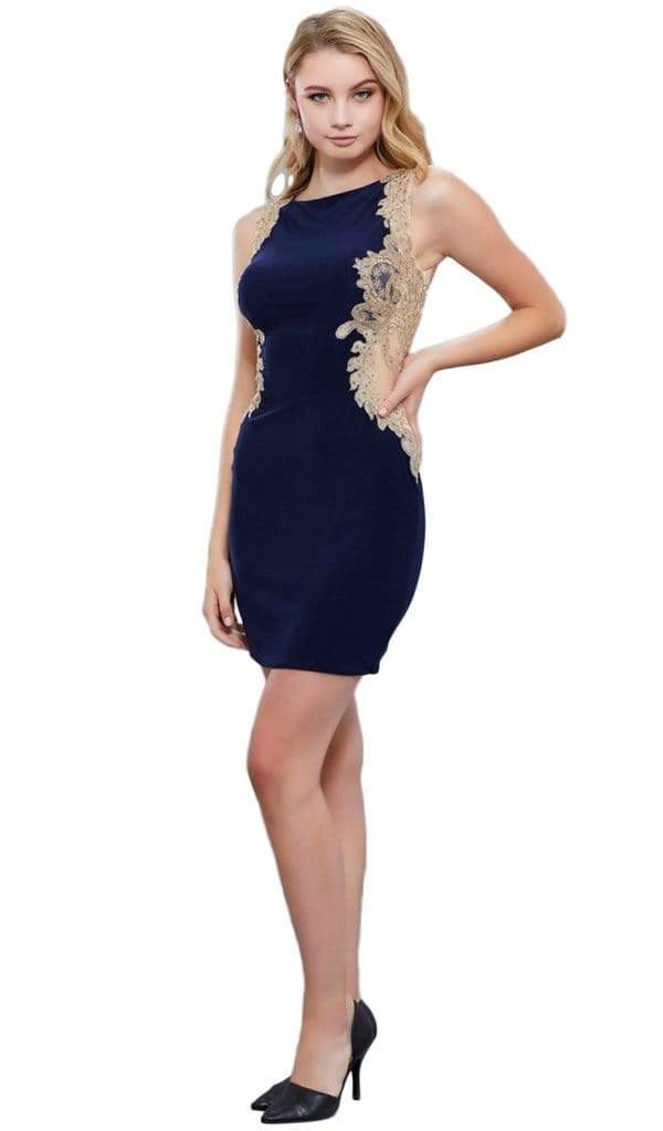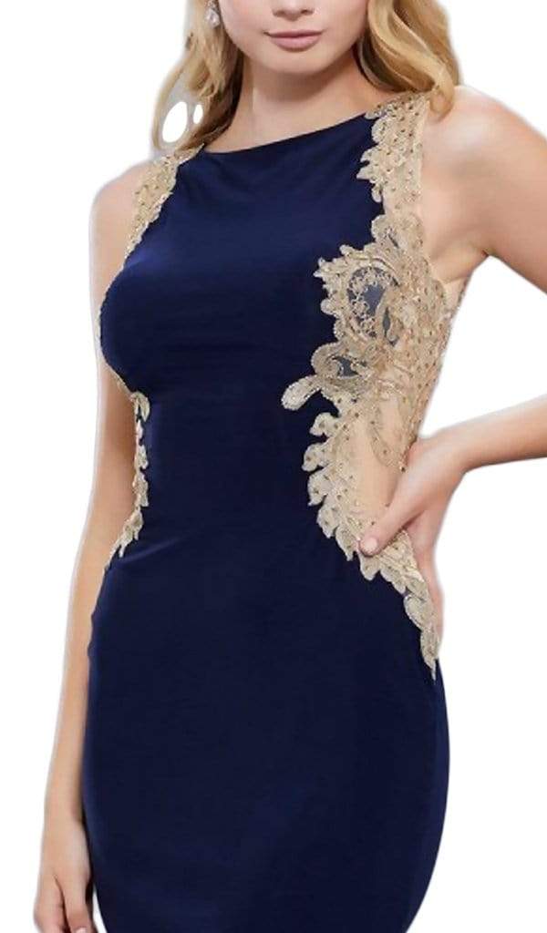 This sleeveless dress delights in a bateau neckline with fitted bodice adorned with gold embellishments. The illusion full back is flourished with gilded intricate appliques. The sheath skirt highlights your curves and runs at mid-thigh hem.