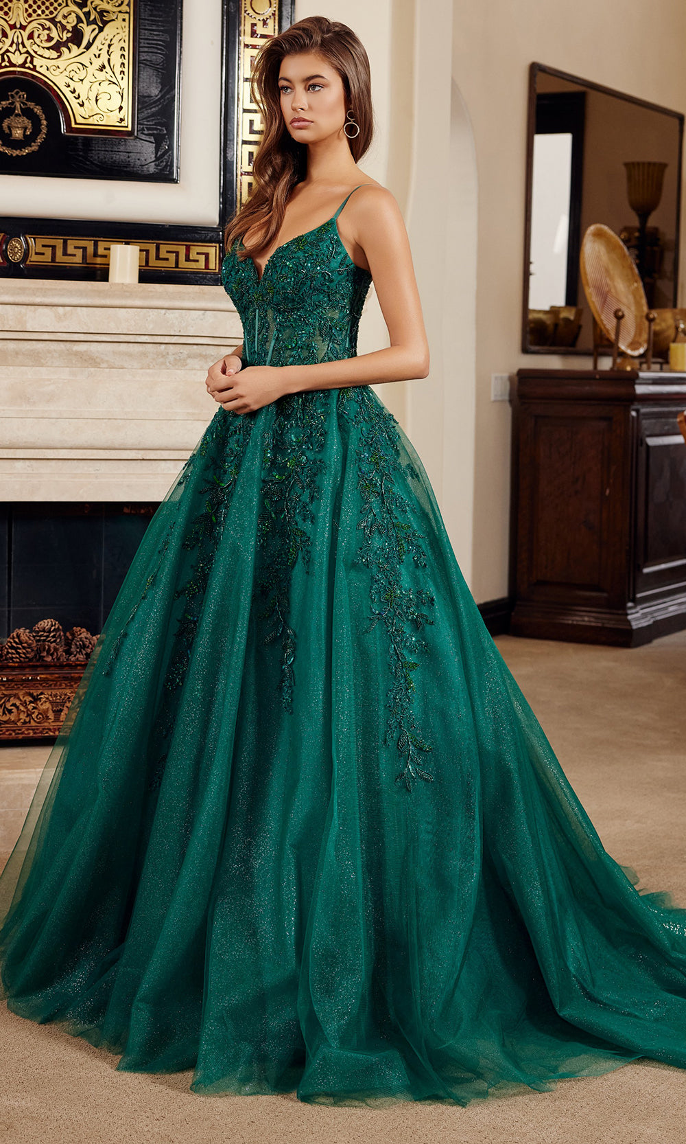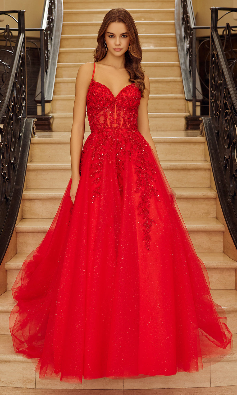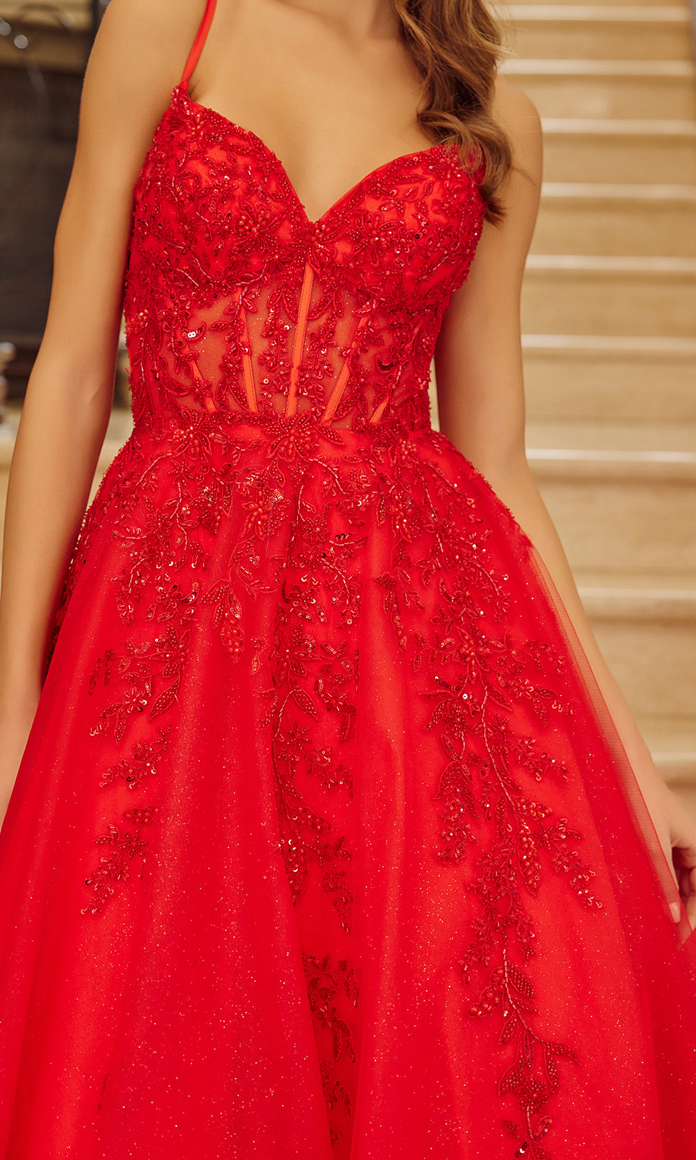 Designed to make a bold and graceful statement, this formal gown from Nox Anabel style H1883 showcases refined craftsmanship and a timeless silhouette. The fitted bodice features intricate lace applique accented with bead embellishment, paired with an illusion inset that adds depth and elegant structure. Slim spaghetti straps provide delicate support while the lace up back allows for an adjustable and flattering fit. Flowing into a full ball gown silhouette, the floor length tulle skirt creates dramatic movement with a soft train finish. Perfect for prom, galas, and formal celebrations, Nox Anabel style H1883 offers unforgettable elegance for any special occasion. Model is wearing Emerald and Red colors.