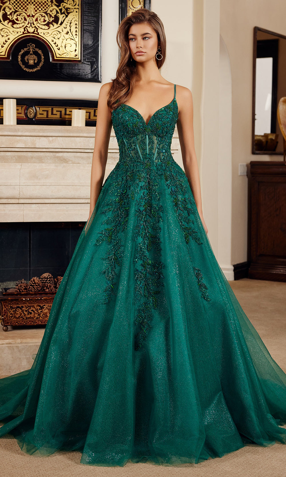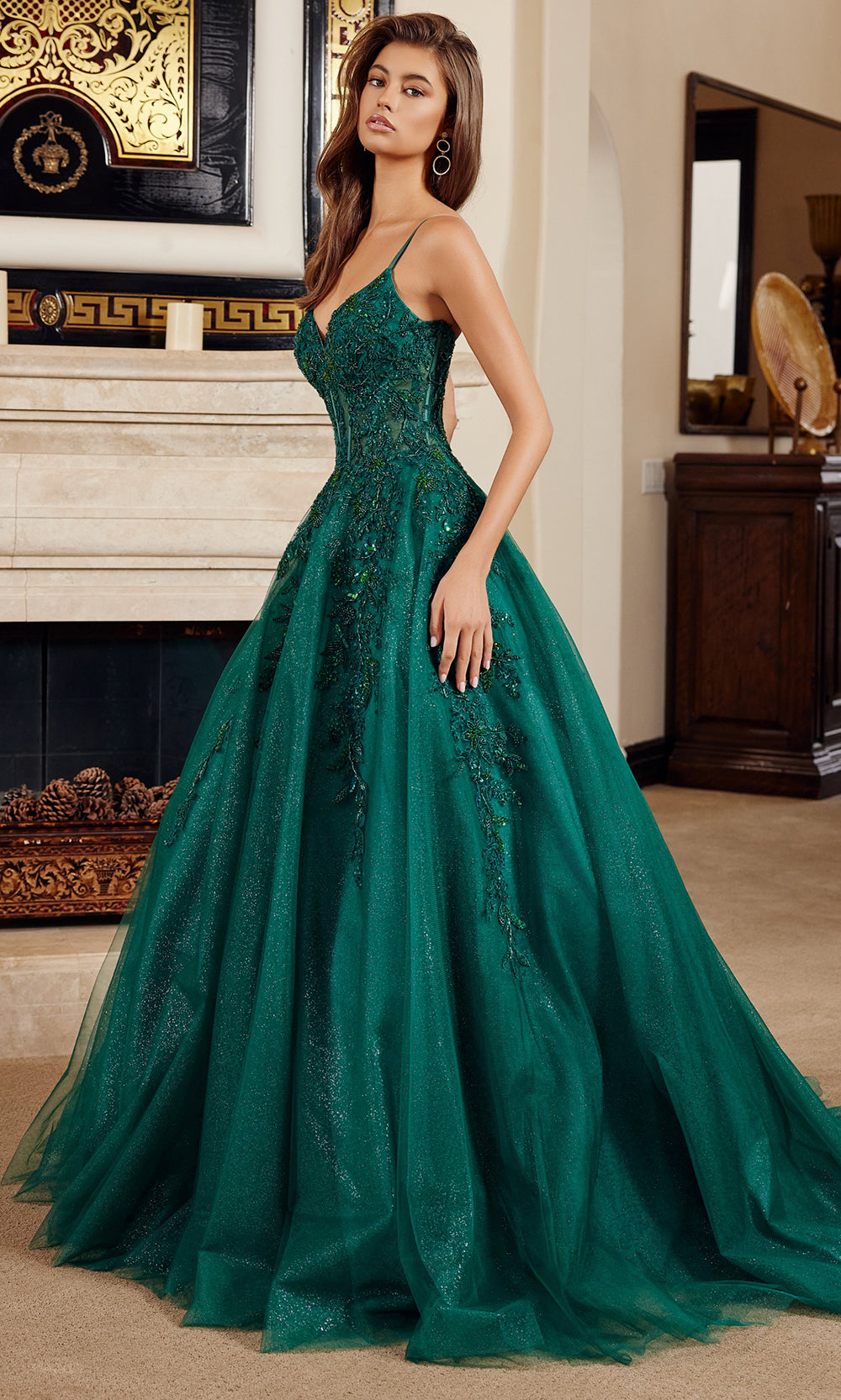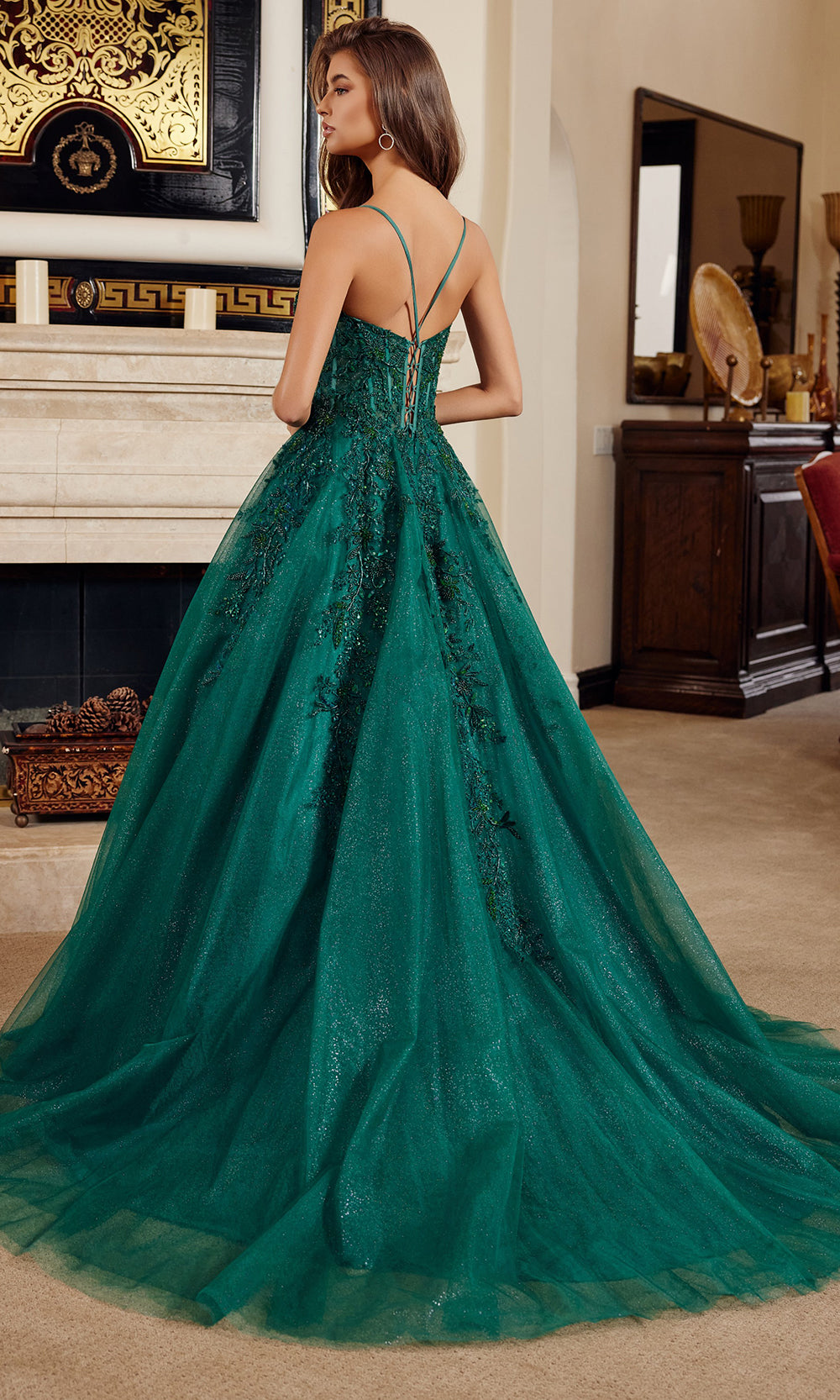 Designed to make a bold and graceful statement, this formal gown from Nox Anabel style H1883 showcases refined craftsmanship and a timeless silhouette. The fitted bodice features intricate lace applique accented with bead embellishment, paired with an illusion inset that adds depth and elegant structure. Slim spaghetti straps provide delicate support while the lace up back allows for an adjustable and flattering fit. Flowing into a full ball gown silhouette, the floor length tulle skirt creates dramatic movement with a soft train finish. Perfect for prom, galas, and formal celebrations, Nox Anabel style H1883 offers unforgettable elegance for any special occasion. Model is wearing Emerald and Red colors.