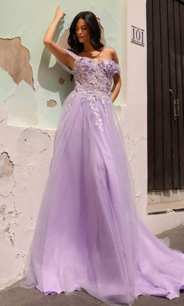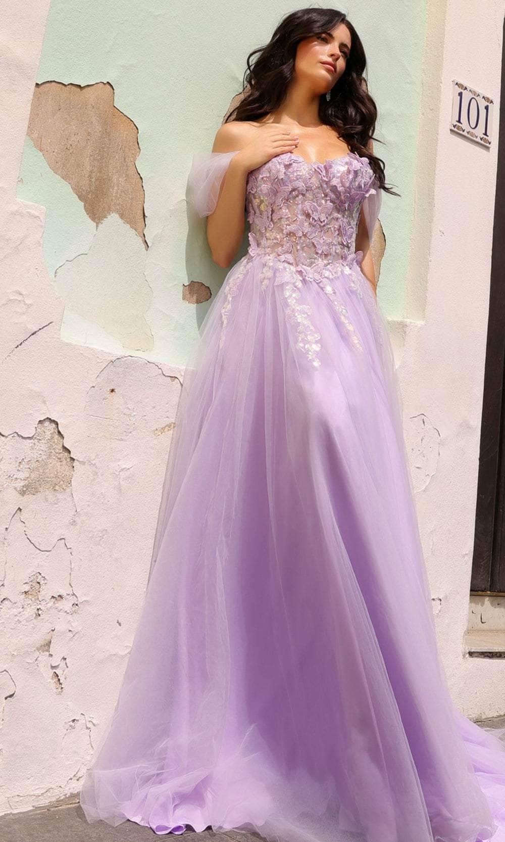 Elegance intertwines with boldness in the Nox Anabel J1324 prom gown, adorned with whimsical 3D butterfly embellishments throughout. Off-shoulder sleeves, with detachable thin straps for a versatile cold-shoulder style, frame the enchanting corset bodice. The sweetheart neckline adds a touch of romance, and the center zipper closure at the back ensures a secure fit. The floor-length skirt gracefully flows in an A-line silhouette, culminating with a charming train. This Nox Anabel J1324 is a captivating choice, seamlessly blending fantasy and elegance for a stunning presence at any prom or formal event. Models are wearing Lilac and Sage Green colors.