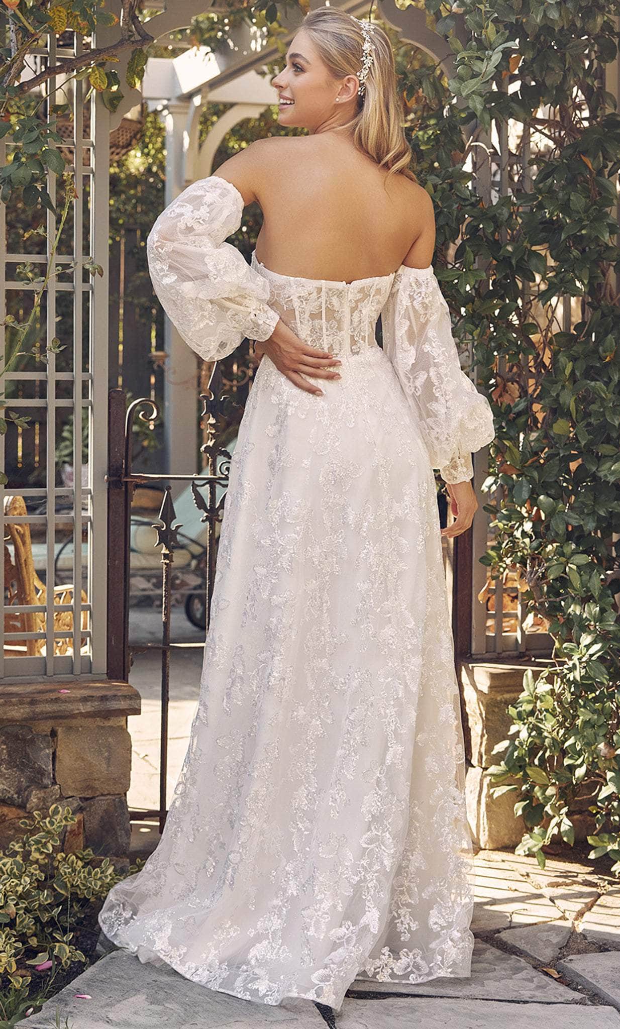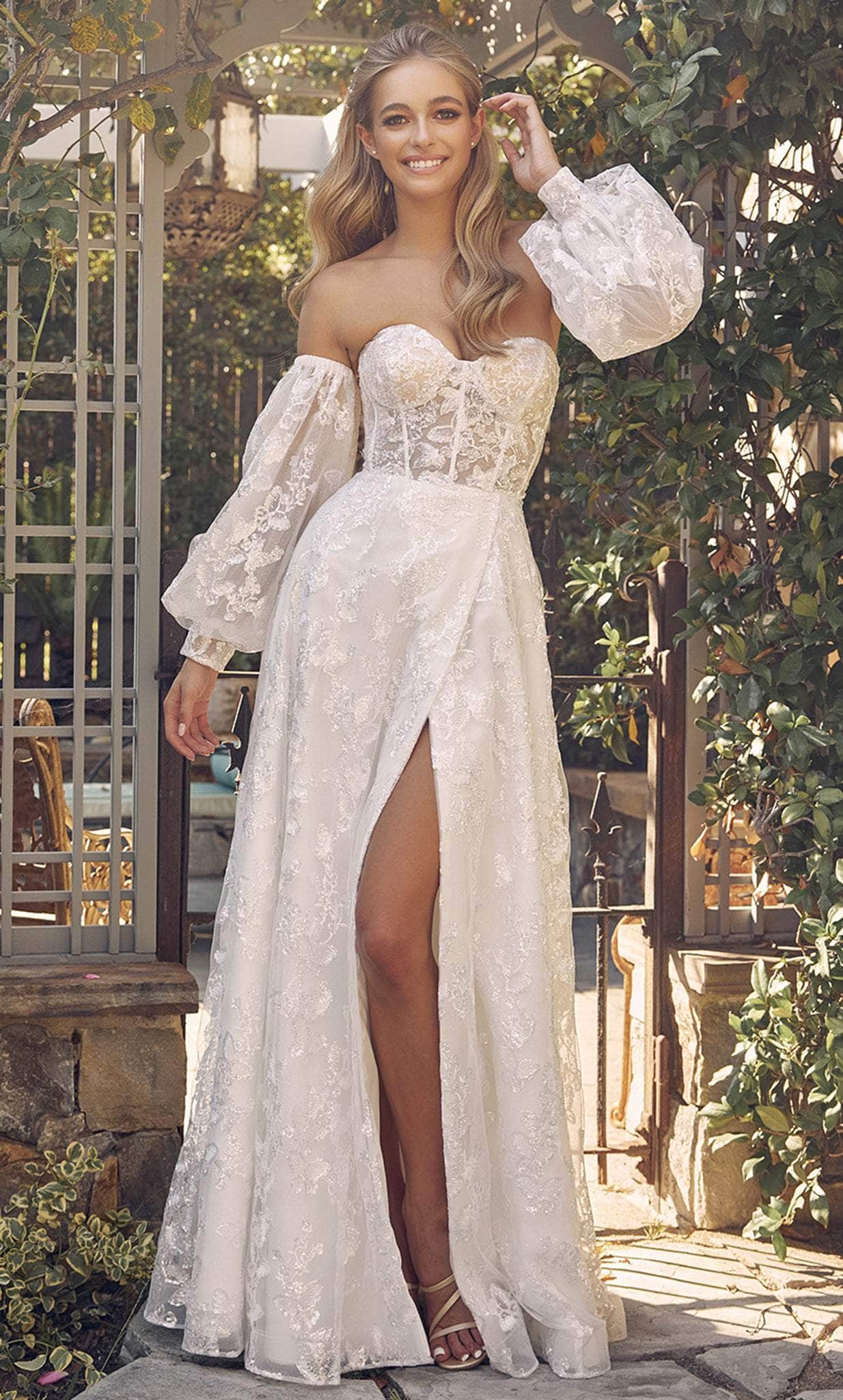 You are more than gorgeous when you wear this unbeatable dress from Nox Anabel K1155W. Gives some Bohemian motif with its puffy detachable long sleeves with a strapless sweetheart neckline. Bodice is corseted to fit it exactly to the wearer’s figure. Has a high slit on one side of A-line silhouette and the whole material is design with embroidery details. Leave a trail of admirers as you glisten in beauty in this Nox Anabel K1155W masterpiece. Model is wearing White color.