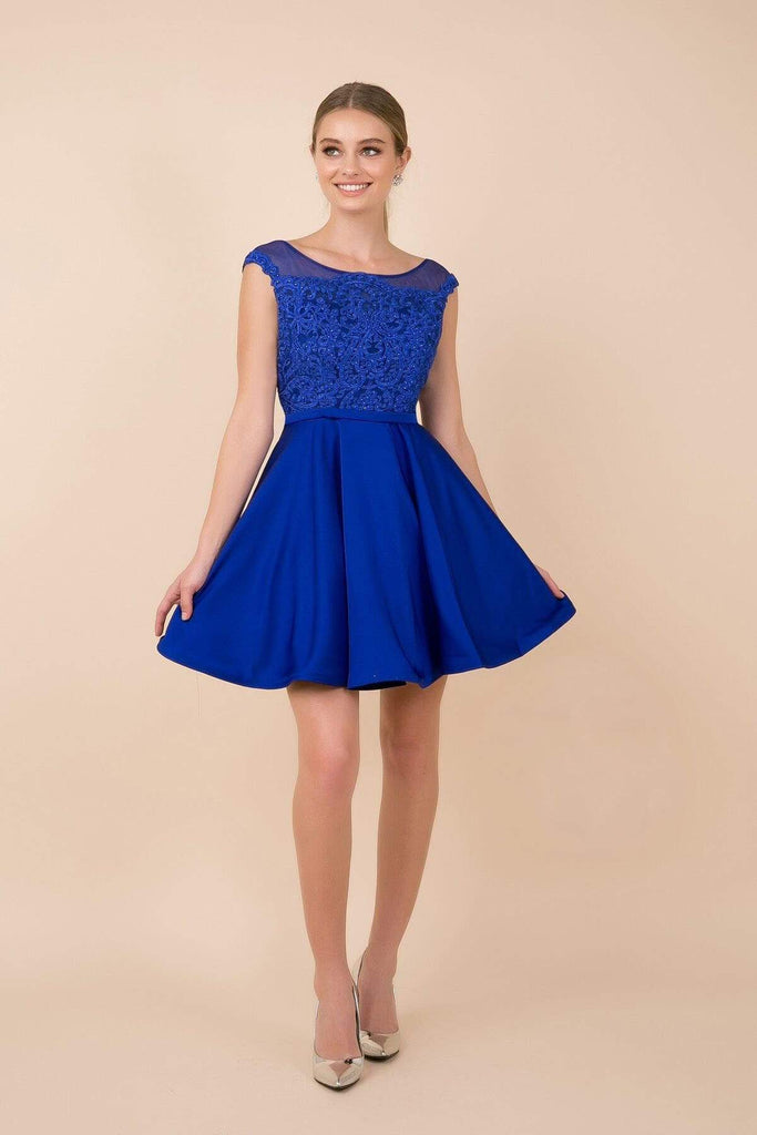 Embellished with rhinestone topped lace fabric, this piece shows a jewel illusion over a sweetheart neckline and a sheer v-shaped open back. Nipped with a slim waistband, the flowing A-line skirt finishes down at a short hem.