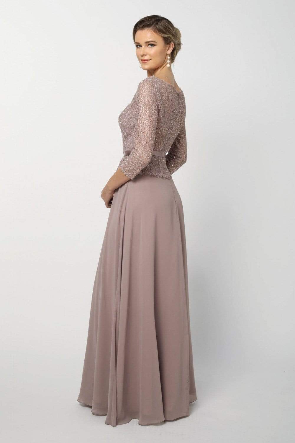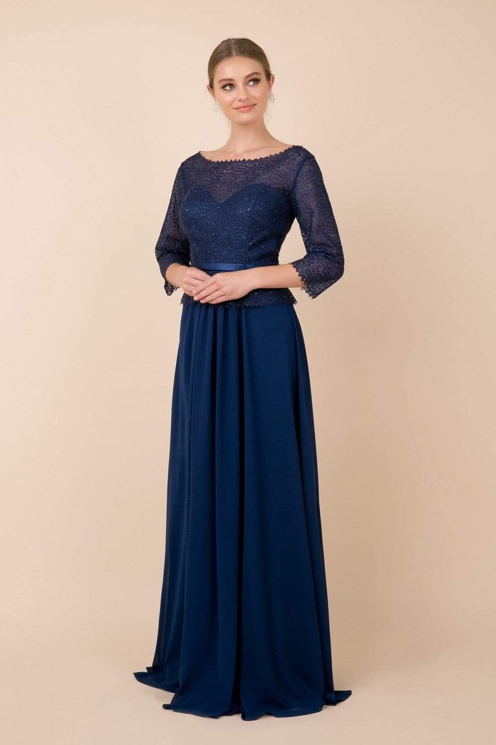 Look amazing for the party in this dress by Nox Anabel M520. Enchants in a lace, bateau neckline with quarter length sleeves. The waist is wrapped in a thin band and features a peplum detail. The skirt flourishes a full length A-line silhouette with a mini train finish. Leave everyone speechless when you enter the room in this Nox Anabel look.