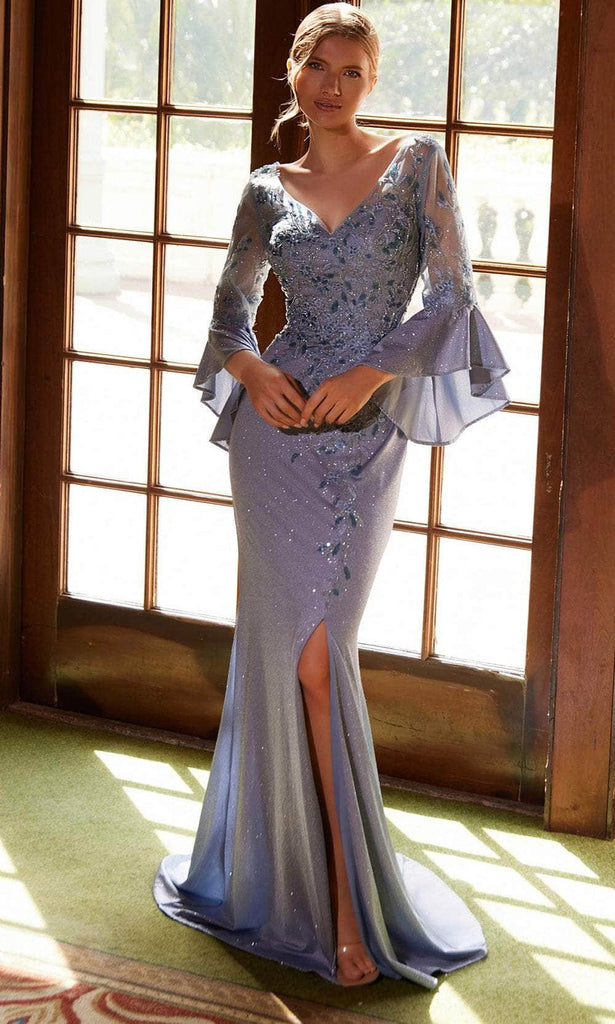 Make a bold entrance in the Nox Anabel MD129 dress. With a V-neckline and floral embellishments, this gown radiates elegance. Bell sleeves add a vintage-inspired charm, while the high slit brings modern sophistication. Step into the spotlight with the Nox Anabel MD129.