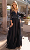 Grace and glamour define the Nox Anabel MF101, a chiffon and glitter mesh gown that sparkles with elegance. The deep V-neckline and sheer beaded bodice create a stunning effect, while the 3/4 sleeves add a touch of sophistication. A flowing chiffon skirt ensures effortless movement, making this dress a perfect choice for any elegant affair. Radiate confidence in the Nox Anabel MF101.