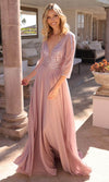 | Details: | Deep V-neck, Sheer beaded bodice, 3/4 sleeves, Flowing chiffon skirt |