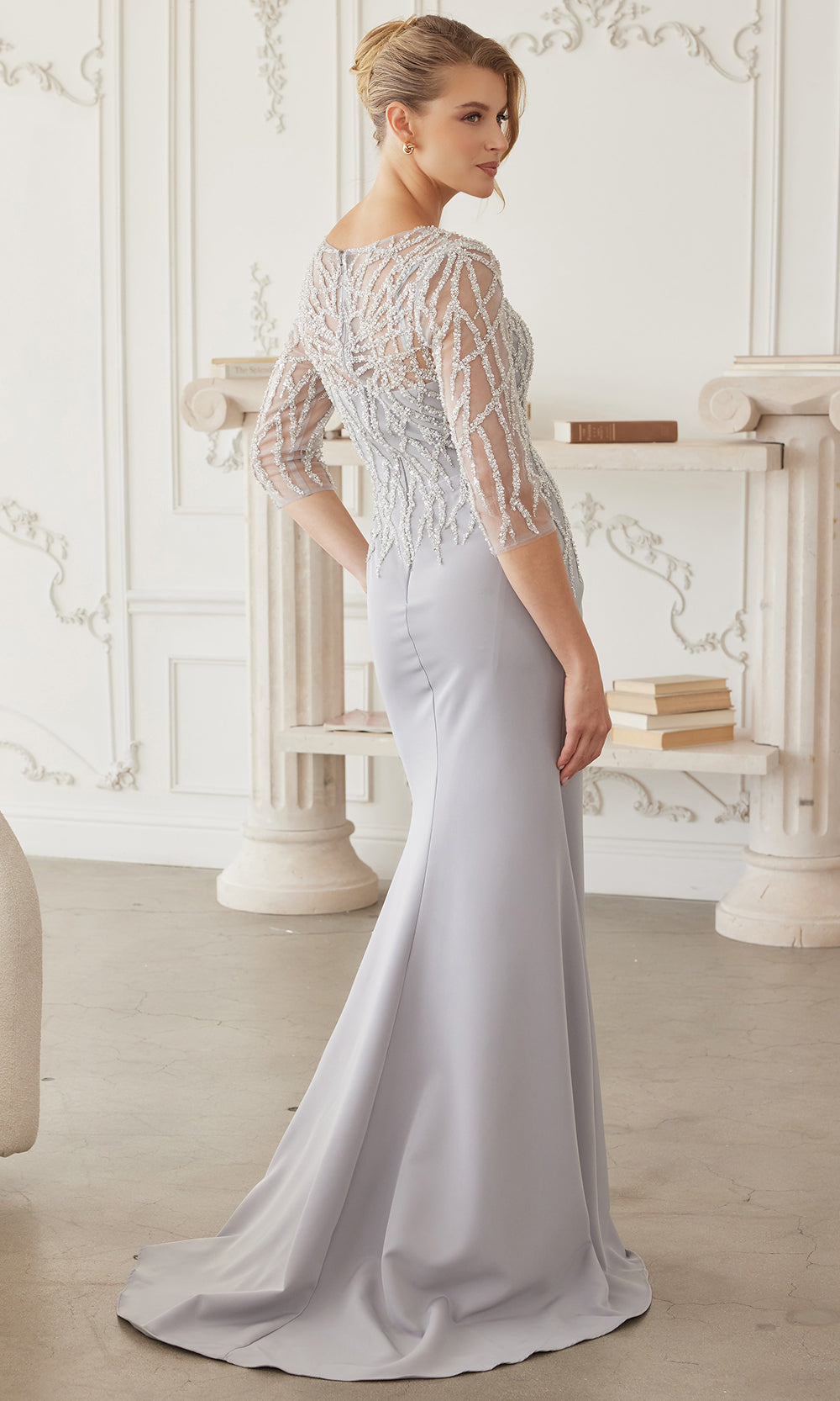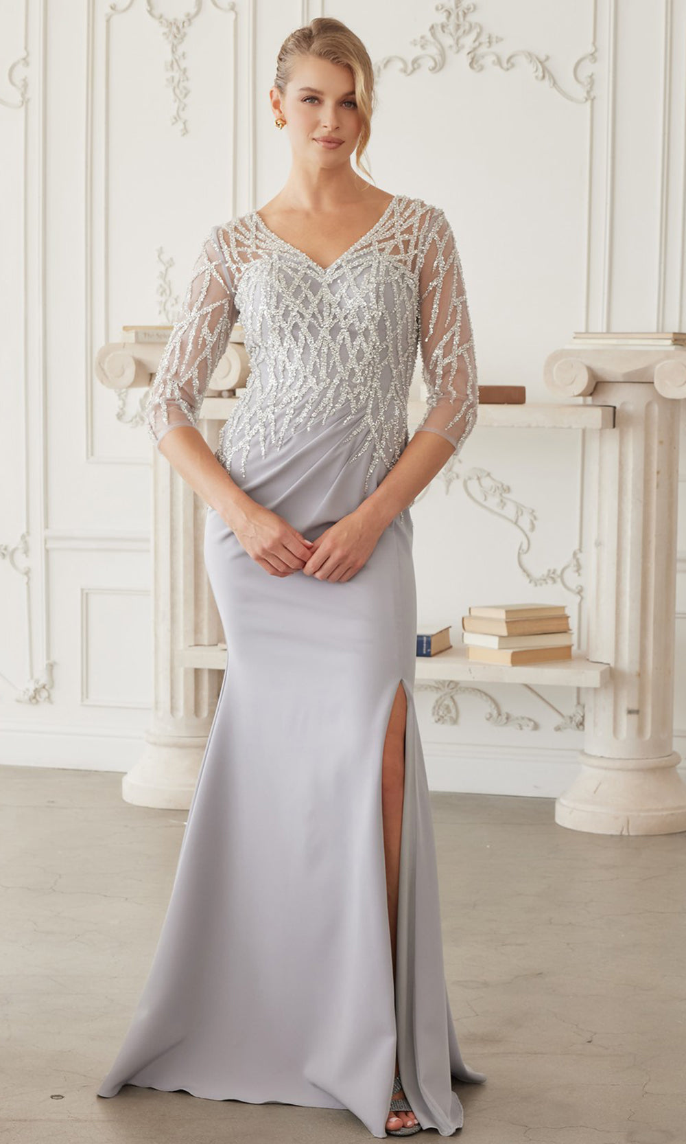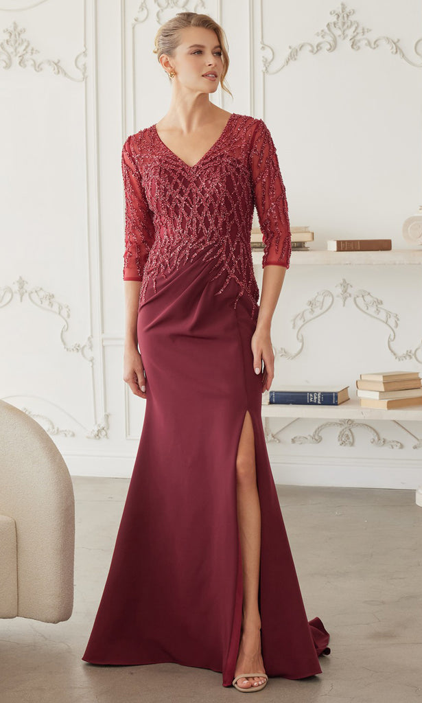 Nox Anabel style MH161 is a beautifully crafted evening gown that blends structured elegance with modern detailing. The bodice features intricate geometric bead embroidery layered over sheer fabric, creating a striking visual effect while maintaining refined coverage through the three quarter sleeves. A flattering V neckline enhances the upper silhouette, drawing attention to the detailed workmanship of the design. The fitted skirt flows gracefully to the floor and includes a subtle side slit that adds movement and ease of wear. Designed for formal gatherings and special celebrations, Nox Anabel style MH161 offers timeless appeal with contemporary sophistication, making it a standout choice for memorable occasions. Model is wearing Burgundy, Navy Blue, and Silver colors.