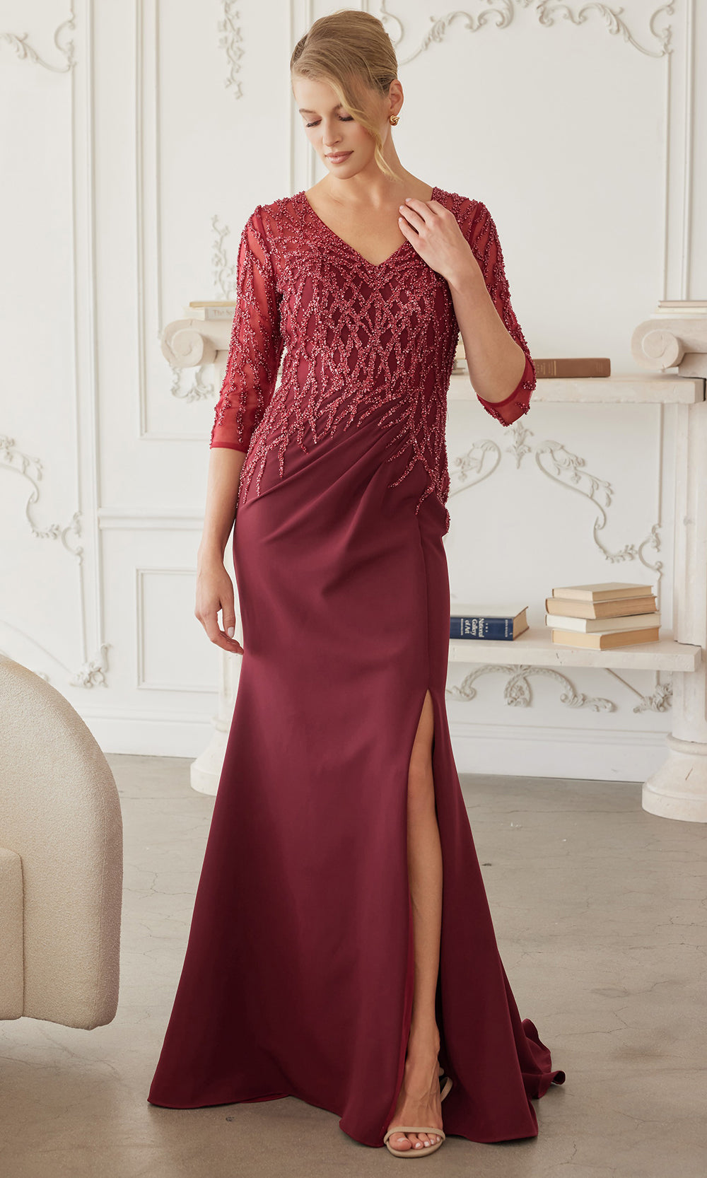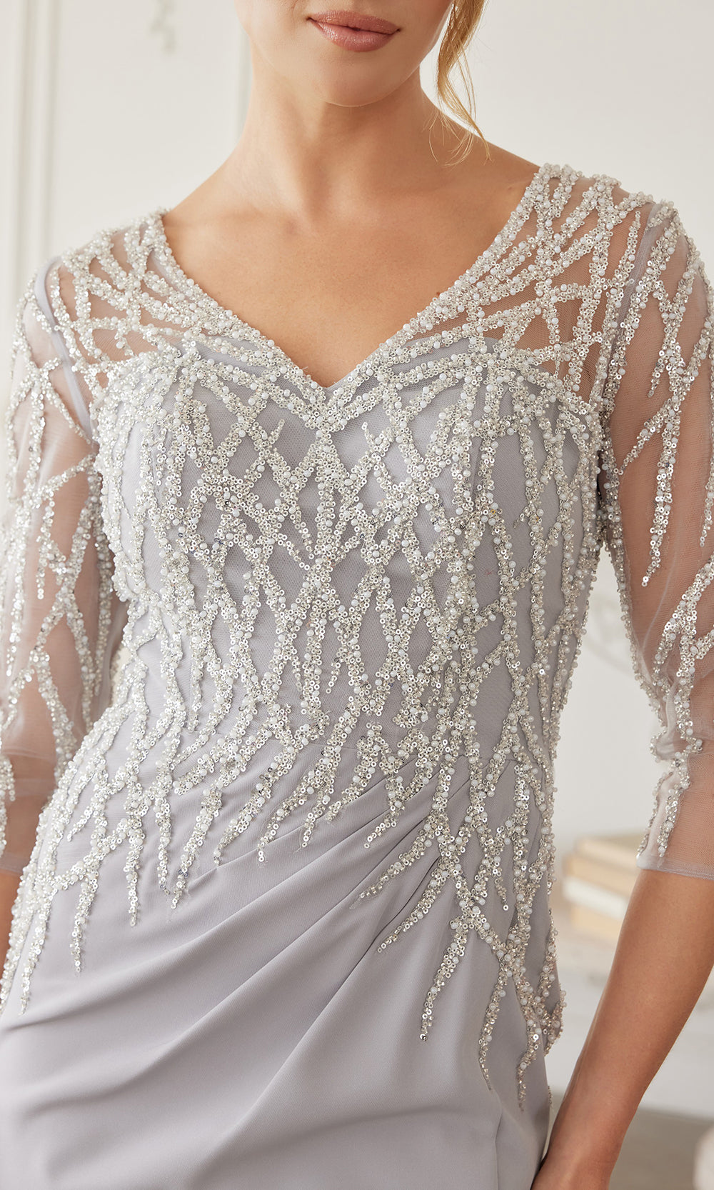 | Details: | Sheer three quarter sleeves, geometric bead embroidery, V neckline, fitted silhouette, floor length skirt, side slit, smooth flowing fabric, concealed back zipper |