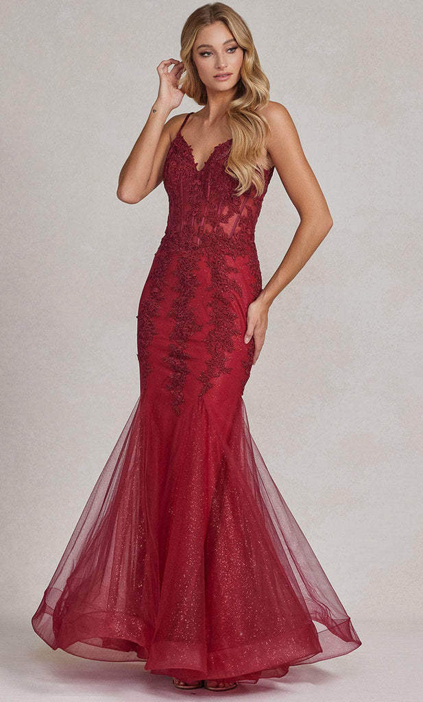 Flourish a chic style that will mesmerize the opulent crowd in this Nox Anabel P1170 creation. Exquisitely adorned with beadwork and embroidery, this sleeveless style features an illusion corset bodice with exposed boning detail, a v-neckline, and a v-open back. The skirt is fitted through the hips and flares out from the knees to create a mermaid silhouette. This Nox Anabel P1170 dress will not let anyone miss your grand entrance. Models are wearing the Burgundy, Emerald and Royal Blue colors.