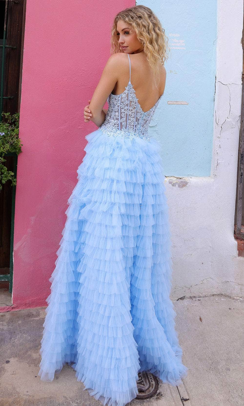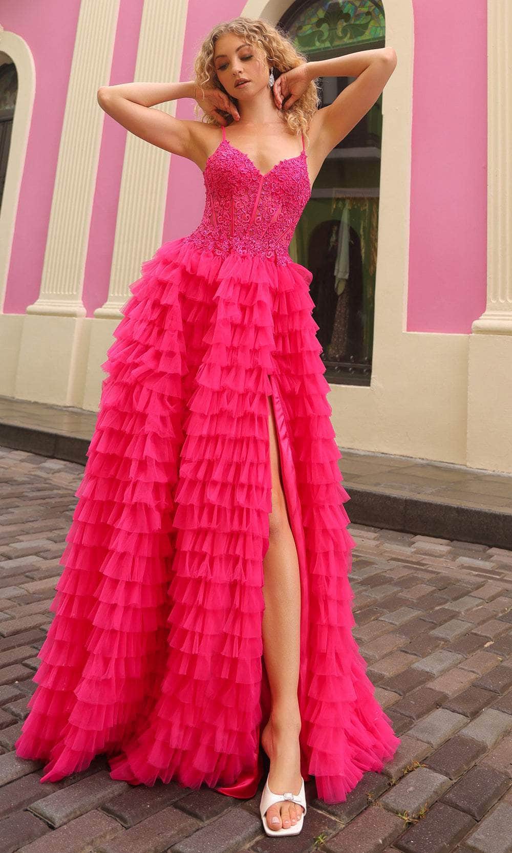 Steal the spotlight in the Nox Anabel P1398 prom dress. The sleeveless corset bodice is a masterpiece adorned with enchanting embroideries, complemented by a V-neckline that exudes grace. The V-shaped back, secured with a zipper closure, ensures a perfect fit. The floor-length tiered skirt dances in a captivating ballgown silhouette, featuring an alluring slit for an extra touch of allure. This Nox Anabel P1398 is a harmonious blend of sophistication and charm, promising a memorable presence at any prom or formal event. Models are wearing Aqua Blue and Fuchsia colors.