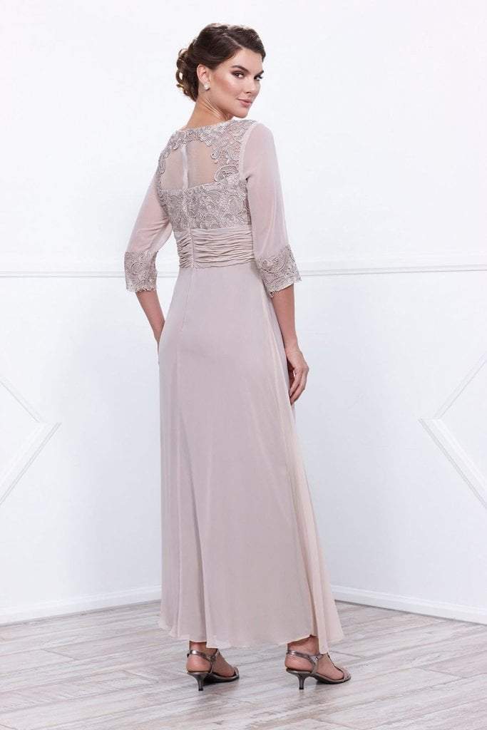 This elegant look from Nox Anabel 5101 shows a sheer top bodice withåÊlace embroidered jewel neckline and quarter length sleeves. The lace embroidered sweetheart bust is complimented by the wide ruched empire waistband. This brilliant ensemble drapes to the dazzling ankle-length hem with modest flare.