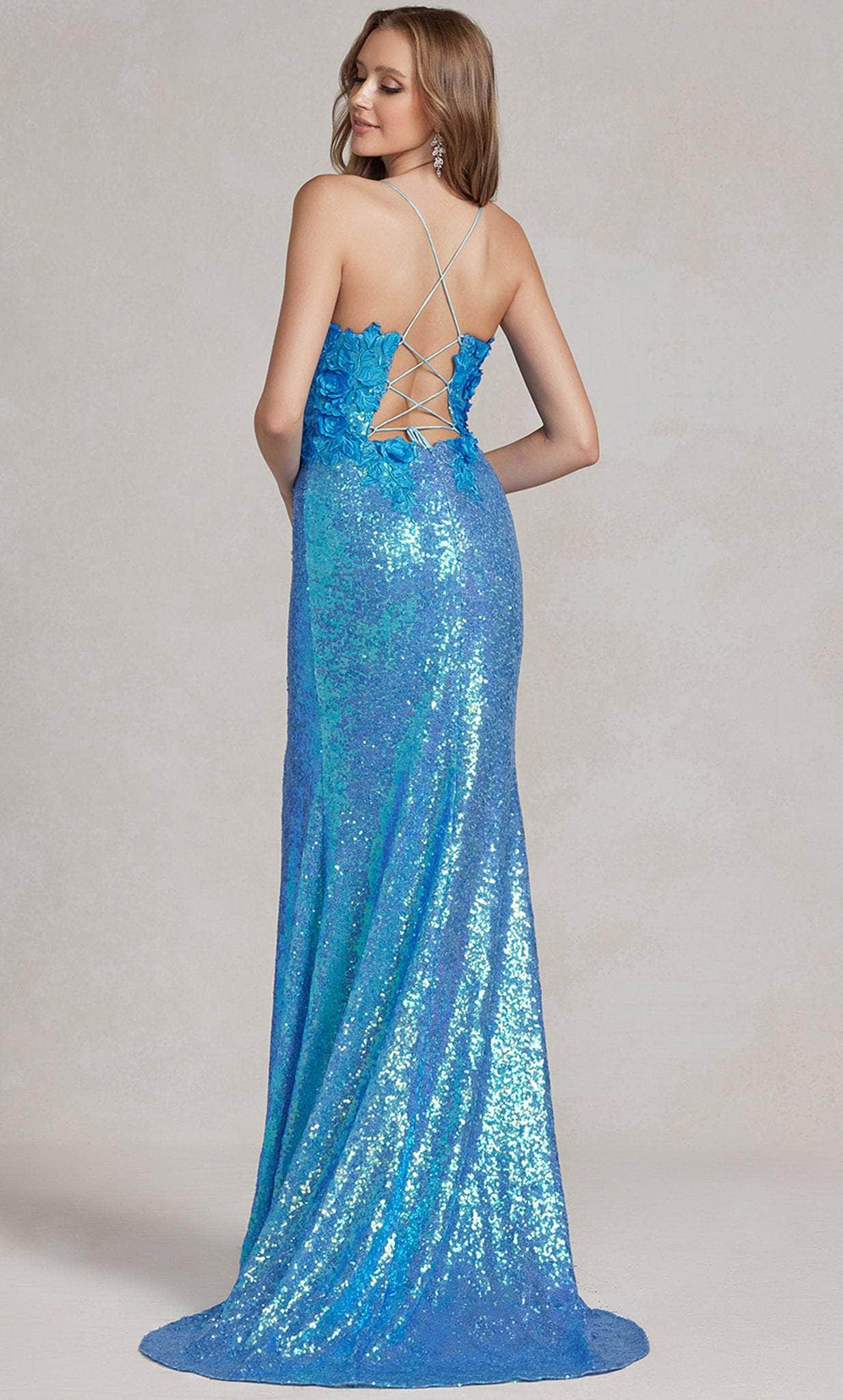 Claim that look of sophistication while looking like a stellar vision in this Nox Anabel R1207 creation. Flatteringly embellished with embroidered details and floral appliques, this sequin ornamented beauty charms with a plunging v-neckline and a sheer inset. Styled with an open back with a lace up detail, a high slit graces the sheath skirt as it streams to the floor with a sweeping train. Don a style that speaks of elegance in this fascinating Nox Anabel masterpiece. Models are wearing the Black, Emerald, Light Purple and Turquoise colors.