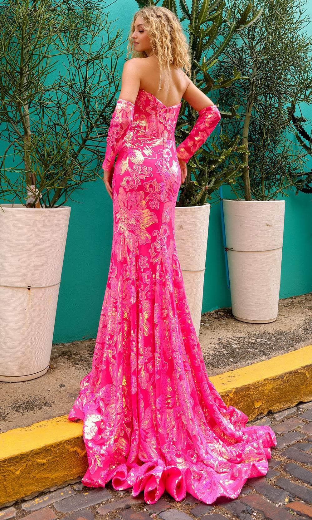 Shimmer with confidence in the captivating Nox Anabel R1268 evening gown, designed to highlight your figure with dazzling detail. This strapless gown features a corset-boned bodice that enhances the waist and provides structured support. Fully adorned with floral-patterned sequins, the gown sparkles beautifully under the lights. A scoop neckline, basque waist, and mid-open back add modern allure. The mermaid silhouette flows into a sweeping train, ensuring a dramatic and elegant finish. Perfect for special events, Nox Anabel R1268 delivers radiant glamour. Models are wearing Fuchsia and Purple colors.