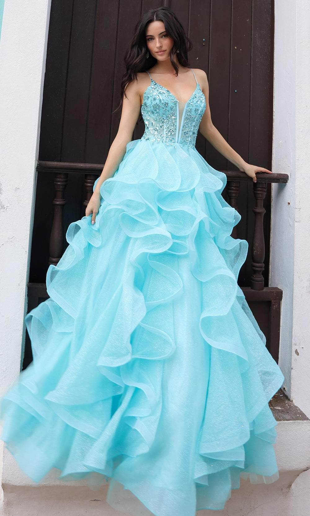 Be the life of the party with Nox Anabel R1433 gown, a masterpiece flaunting a sleeveless sheer corset bodice adorned with intricate embroideries and sparkling rhinestones. The plunging V-neckline, complemented by a sheer insert, adds allure to the elegant ensemble. A lace-up tie at the back ensures a perfect fit. The floor-length ruffled skirt cascades in a ballgown silhouette, concluding with a captivating train. Nox Anabel R1433 is a captivating choice, blending sophistication and drama for a memorable presence at any formal occasion. Model is wearing Aqua Blue color.