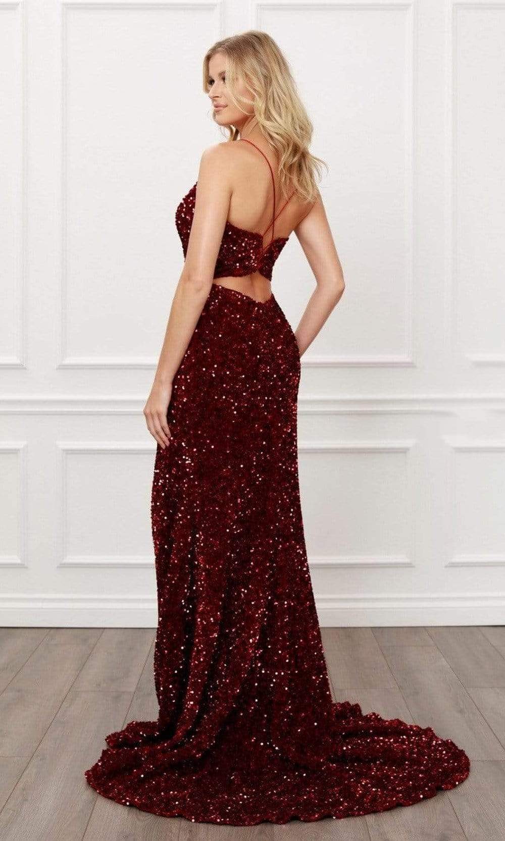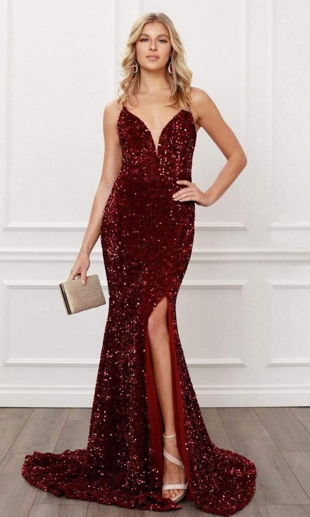 Red hot and ravishing, this incredible evening gown by Nox Anabel R433. Sizzle in hotness as you wear this evening dress embellished with shiny sequins throughout. It parades a full-length sheath silhouette with a thigh-high slit and features a V neckline and cut-out back on the fitted bodice. This shining ensemble evening gown by Nox Anabel is perfect for your senior prom!