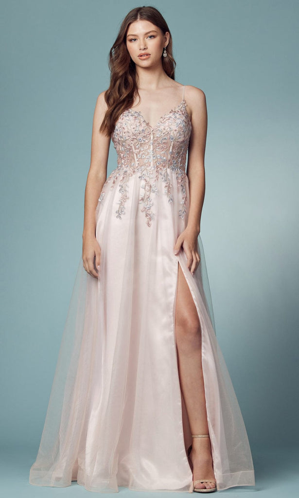 Be the spectacular belle on your next formal event in Nox Anabel S1015 evening gown. Ornamented with sprinkled of beads and floral lace embroidery, this gown  reveals a sheer corset bodice, low V neckline and open back supported with adjustable spaghetti straps. The skirt opens with a front side slit as it flows into full length A-line silhouette. This Nox Anabel masterpiece is sure to make you the darling of the party! This stunning collection of Nox Anabel dresses will reflect your personality and give you an elegant red-carpet look. Model is wearing Blush color.