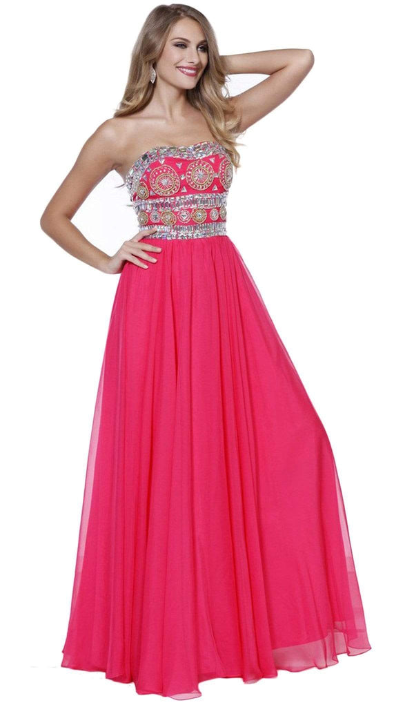 Glamour rushes from every details of this chic strapless Nox Anabel 8153 creation. Features a strapless modified sweetheart bustline of precious gemstones embellished bodice. The full-length A-line skirt flaunts a mesh layered overlay that gracefully flows to the floor. If you are going for ritzy glamour special occasion, this gown is perfect! Model is wearing the Royal Blue, Fuchsia and Nude colors.