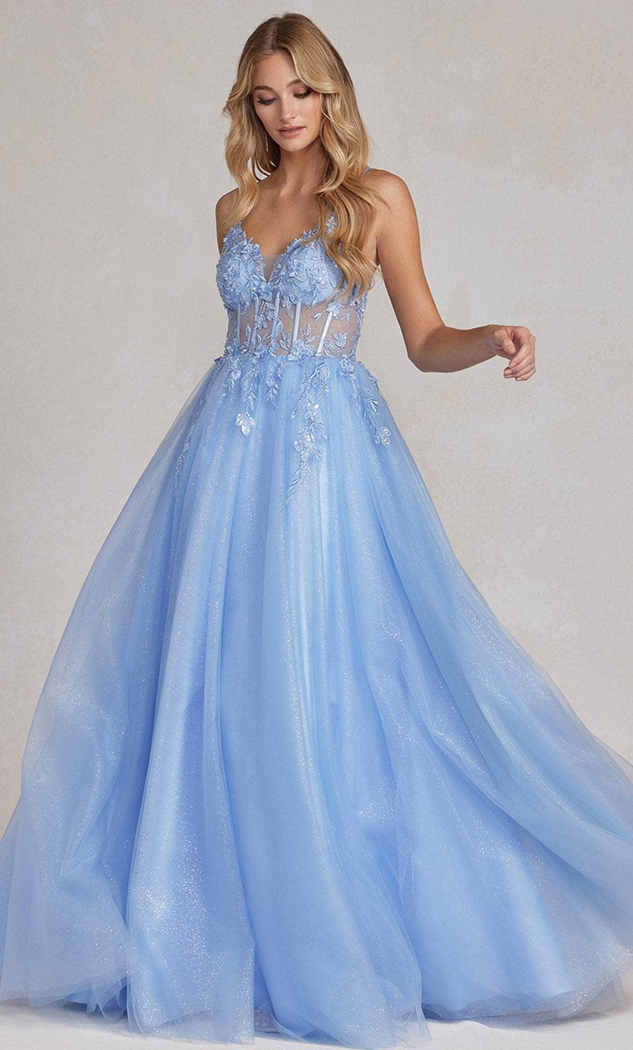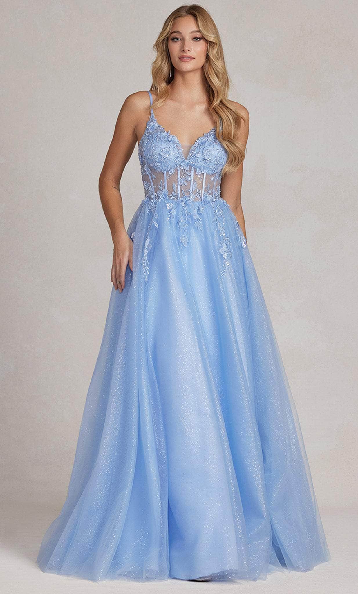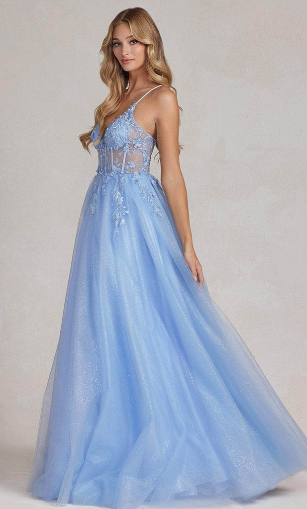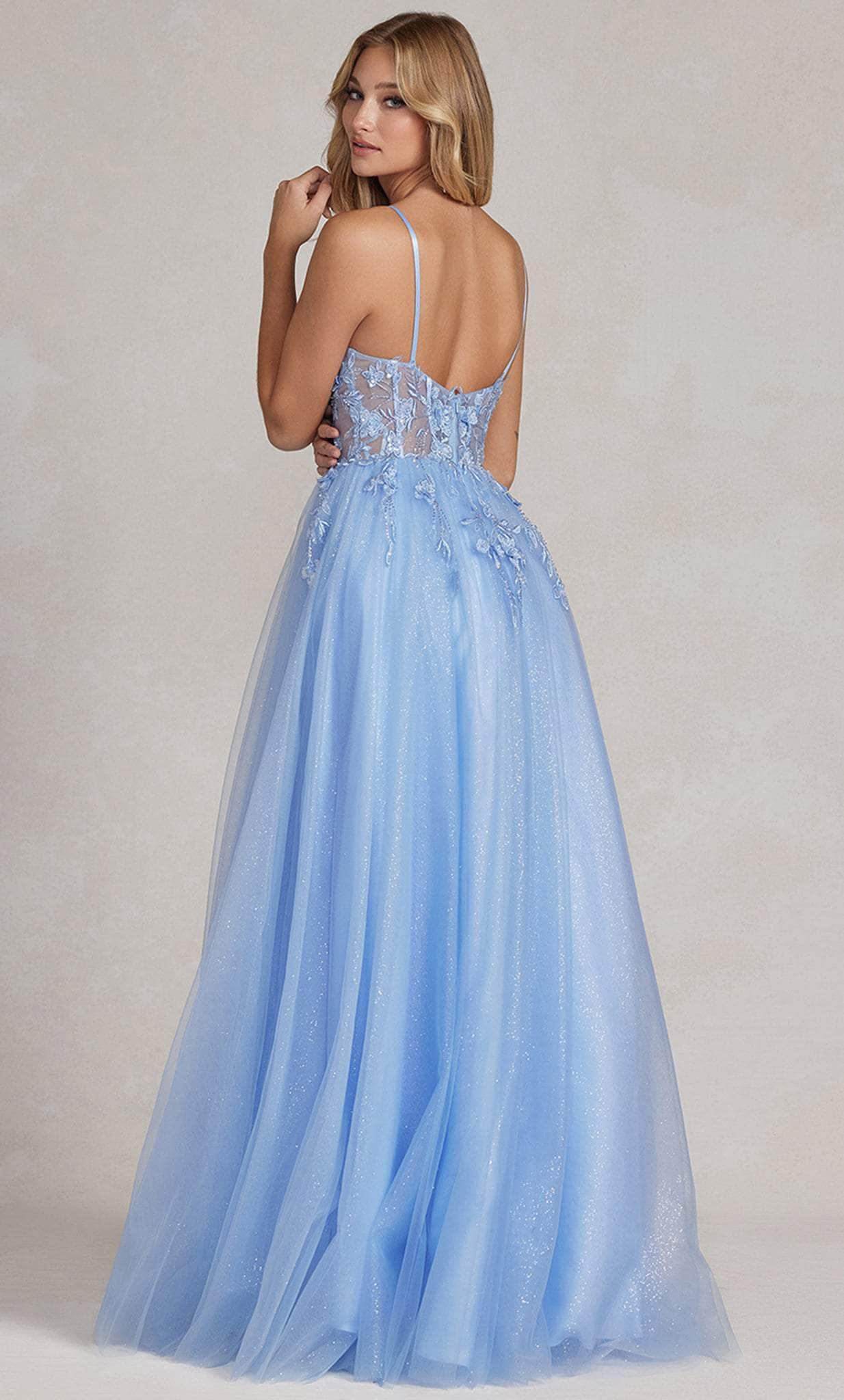 Get glamorous underneath the modern and classic detailing on the A-line silhouette of Nox Anabel T1083. This beautiful dress gives you a princess vibe with its glittering A-line silhouette that flows into full length. It features V neckline, corset sheer bodice, and embroidery details attached to this gown. Back cuts to a low style to expose some skin. This Nox Anabel T1083 is awesome for prom or for any special night event! Model is wearing Blue color.