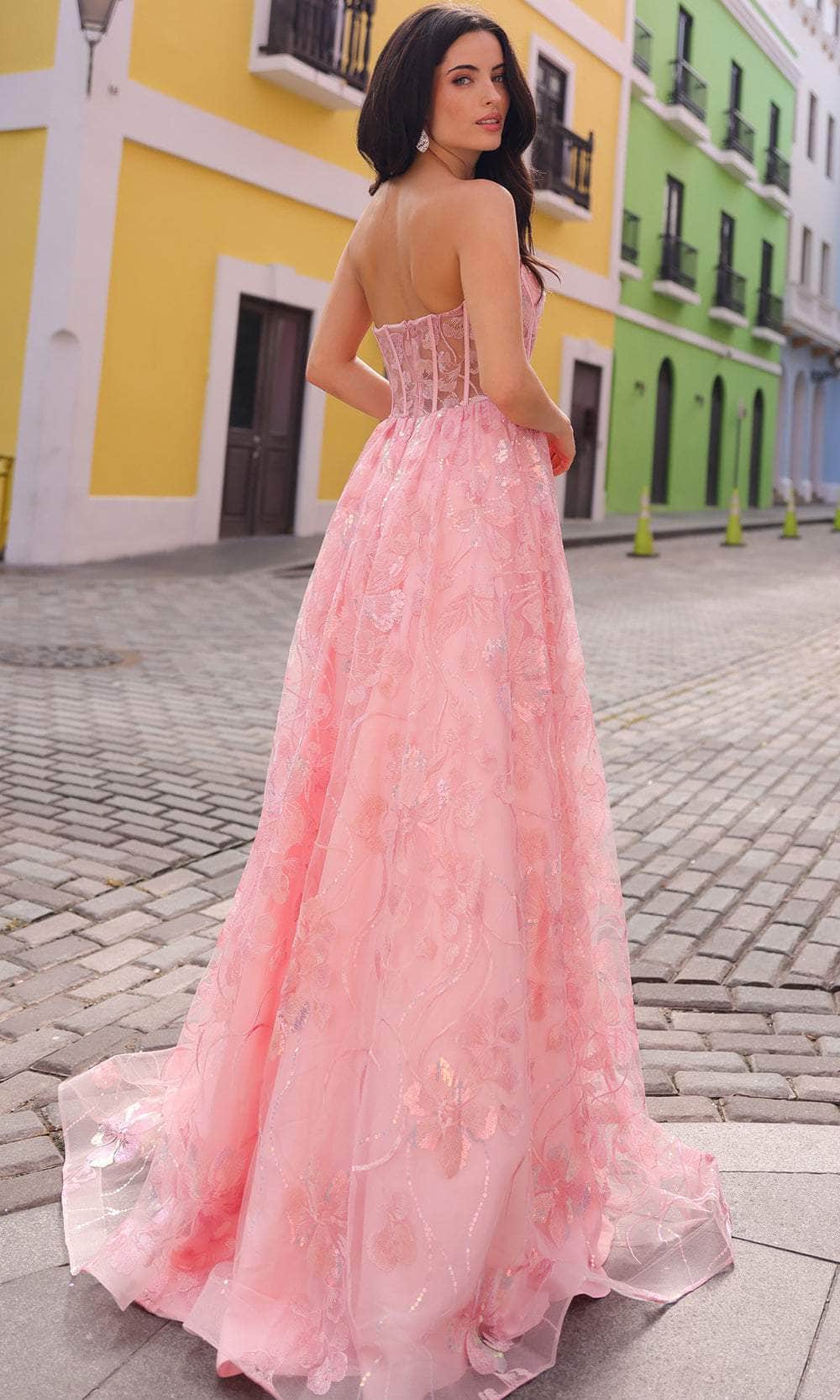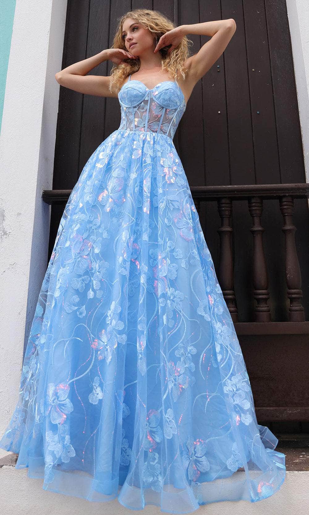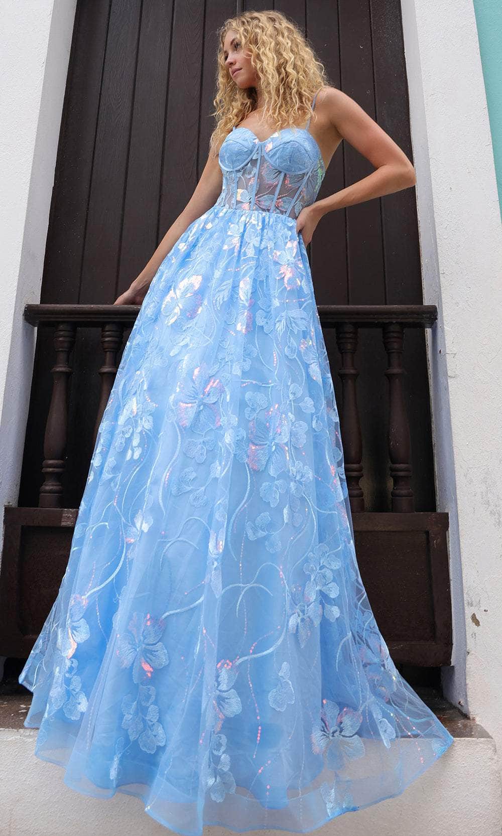 Exude elegance in the Nox Anabel T1332 A-line gown, adorned with a blossoming floral print and gleaming sequins throughout. The sleeveless sheer corset bodice, with detachable straps for a strapless option, boasts a sweetheart neckline for a touch of romance. A back center zipper closure ensures a secure fit. The floor-length skirt, finished with a horsehair hem and a train, completes this enchanting dress. Nox Anabel T1332 is a floral-inspired masterpiece, offering a perfect blend of sophistication and charm for a memorable formal event. Models are wearing Blush, and Dusty Blue colors.