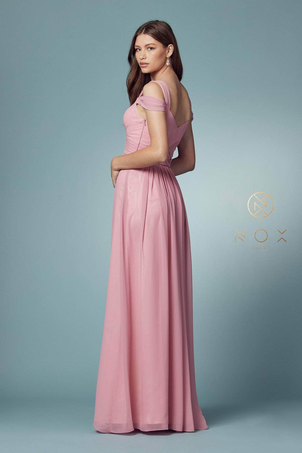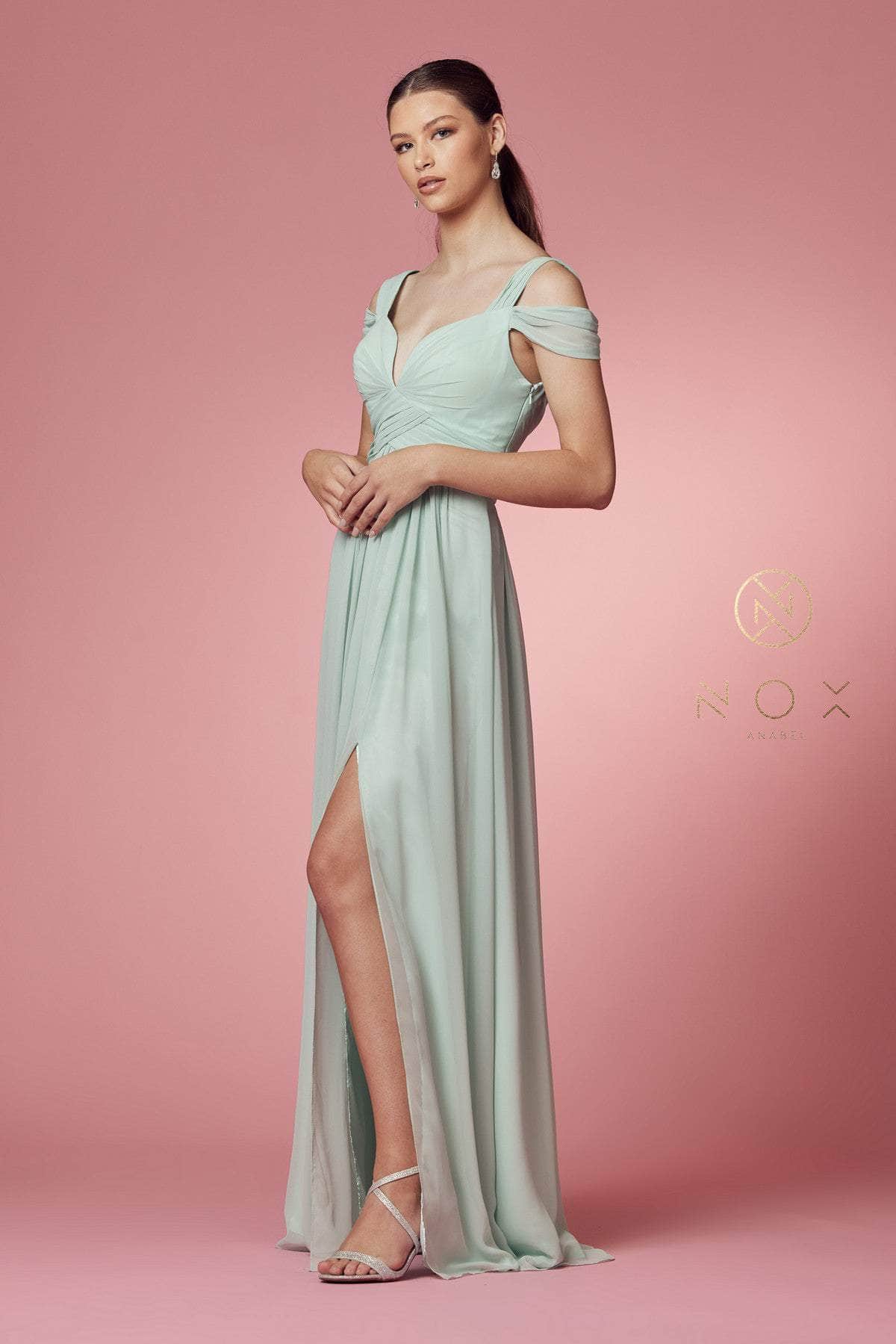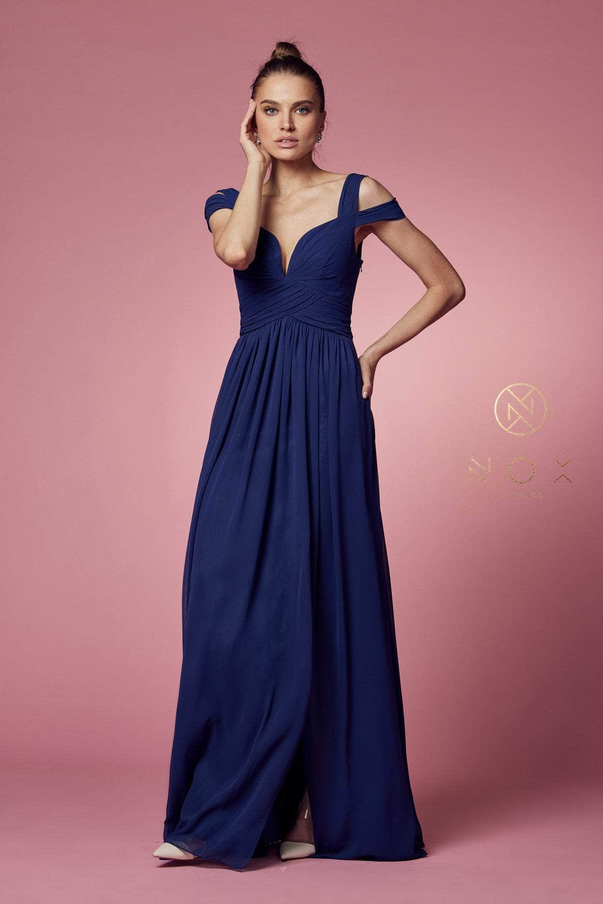 Look classy and chic in this elegant long dress by Nox Anabel Y277P. Flourishes with a structured V-neckline and cut-in cold shoulder sleeves, with faux crossover pleated style along the fitted midriff. The skirt showcases an A-line silhouette with long front slit and full-length hemline . Make it a romantic occasion with this ensemble by Nox Anabel.