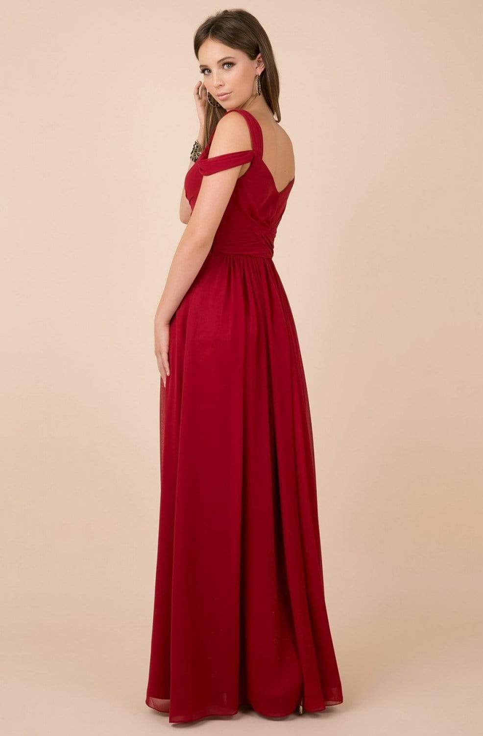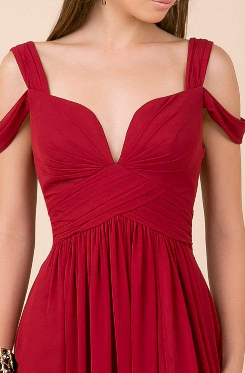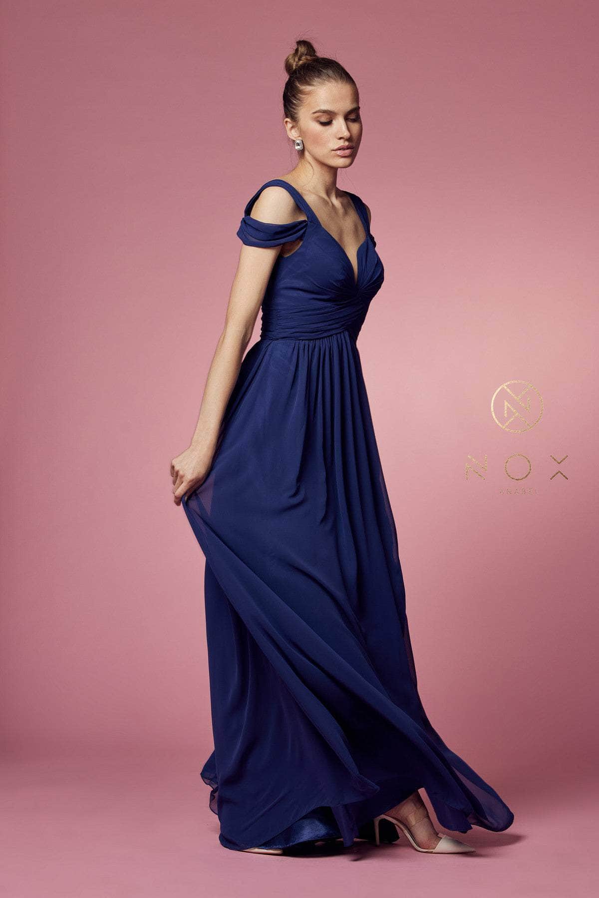Look classy and chic in this elegant long dress by Nox Anabel Y277P. Flourishes with a structured V-neckline and cut-in cold shoulder sleeves, with faux crossover pleated style along the fitted midriff. The skirt showcases an A-line silhouette with long front slit and full-length hemline . Make it a romantic occasion with this ensemble by Nox Anabel.