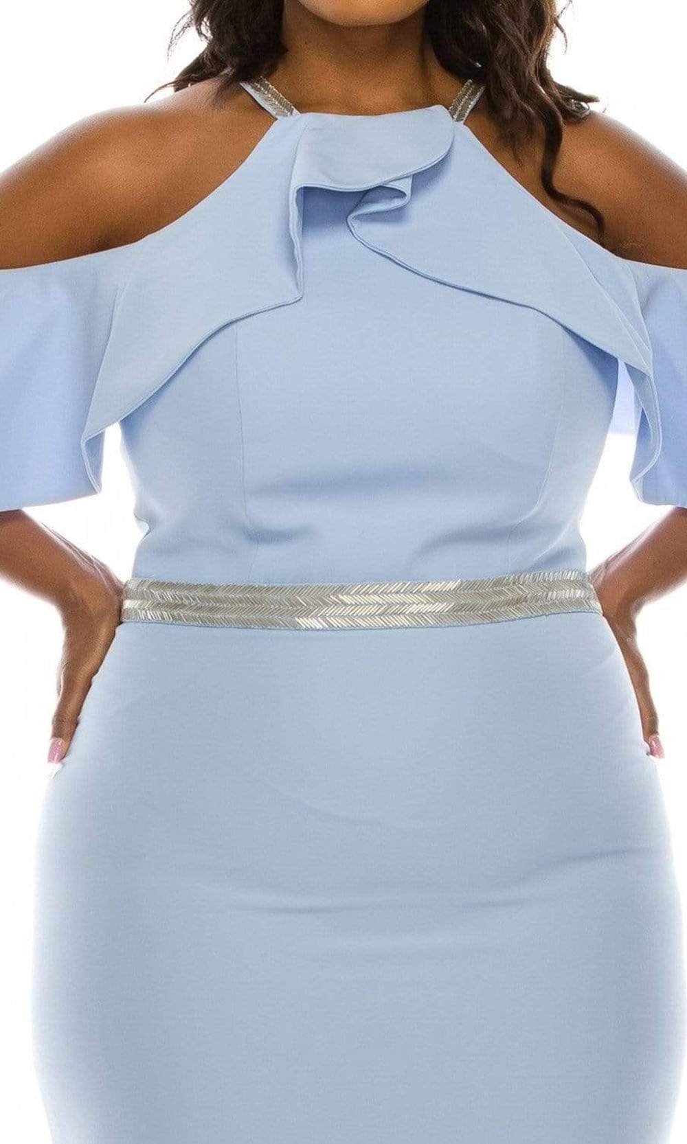 Wrap up in this winning style for evening by Odrella 4513. The halter neckline bodice has ruffle flounce extending through the fluttery sleeves while flaunting a cold-shoulders style. The natural waist is highlighted by a beaded waistband leading to the full-length trumpet skirt. The dress finishes with a subtle and elegant sweep train. Stand out in this fashionable piece for formal and Black-tie event from Odrella.