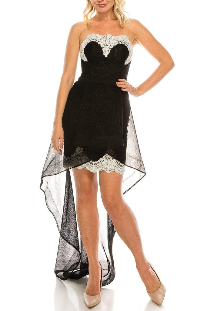 Look ultra-chic in this stunning Odrella 4572 masterpiece. This glamorous evening dress has an embroidered lace strapless sheath dress with embellished white embroidered scalloped lace trims framing the top and bottom. At the waistband, a marvelous hexagon mesh high low skirt is layered over, and it cascades down into a sweep train. Flourish a fashionable style that will mesmerize the opulent crowd in this gorgeous Odrella creation.