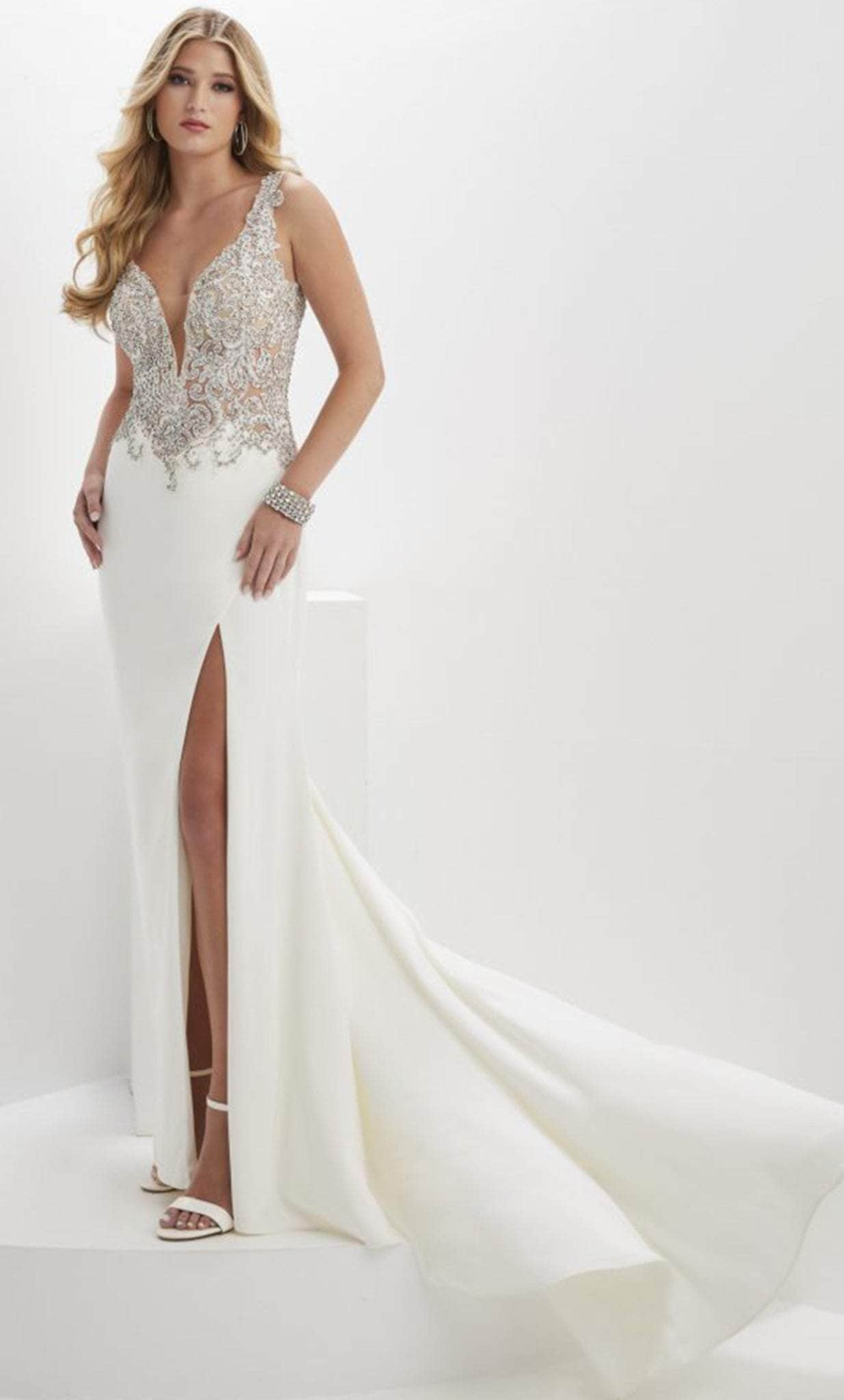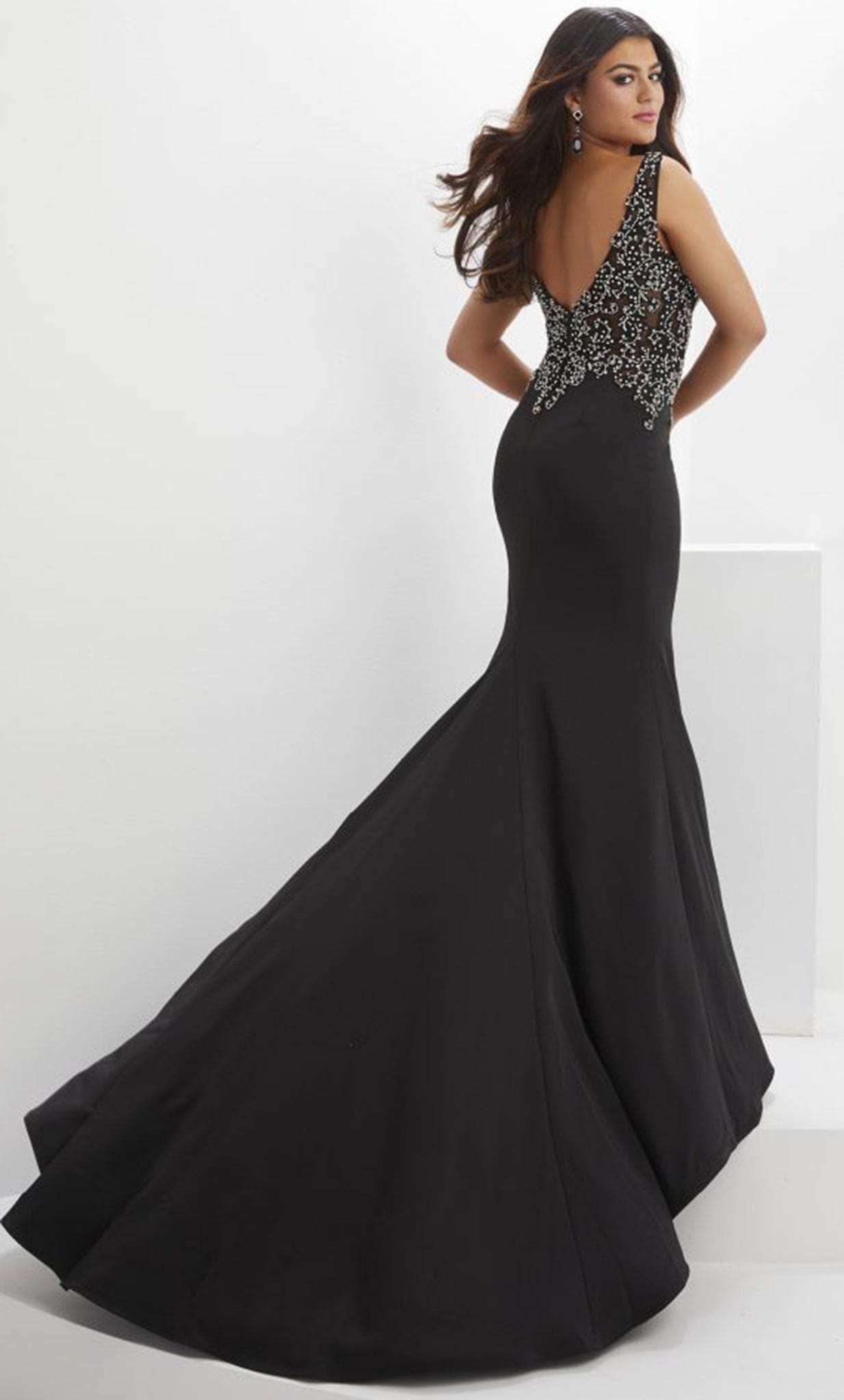 You are more than gorgeous when you wear this unbeatable creation from Panoply 14151. Astonishingly ornate with rhinestones beading and lace appliques on the sheer bodice, this gown will definitely make heads turn. The sleeveless style features a sheer inset on the plunging v-neckline and wide shoulder straps that fall to the low v-open back. The skirt displays a trumpet silhouette that flows elegantly to a full length hem and sweeping train. Create magical moments as you revel in Panoply 14151 evening gown. Models are wearing the Black, Ivory and Red colors.