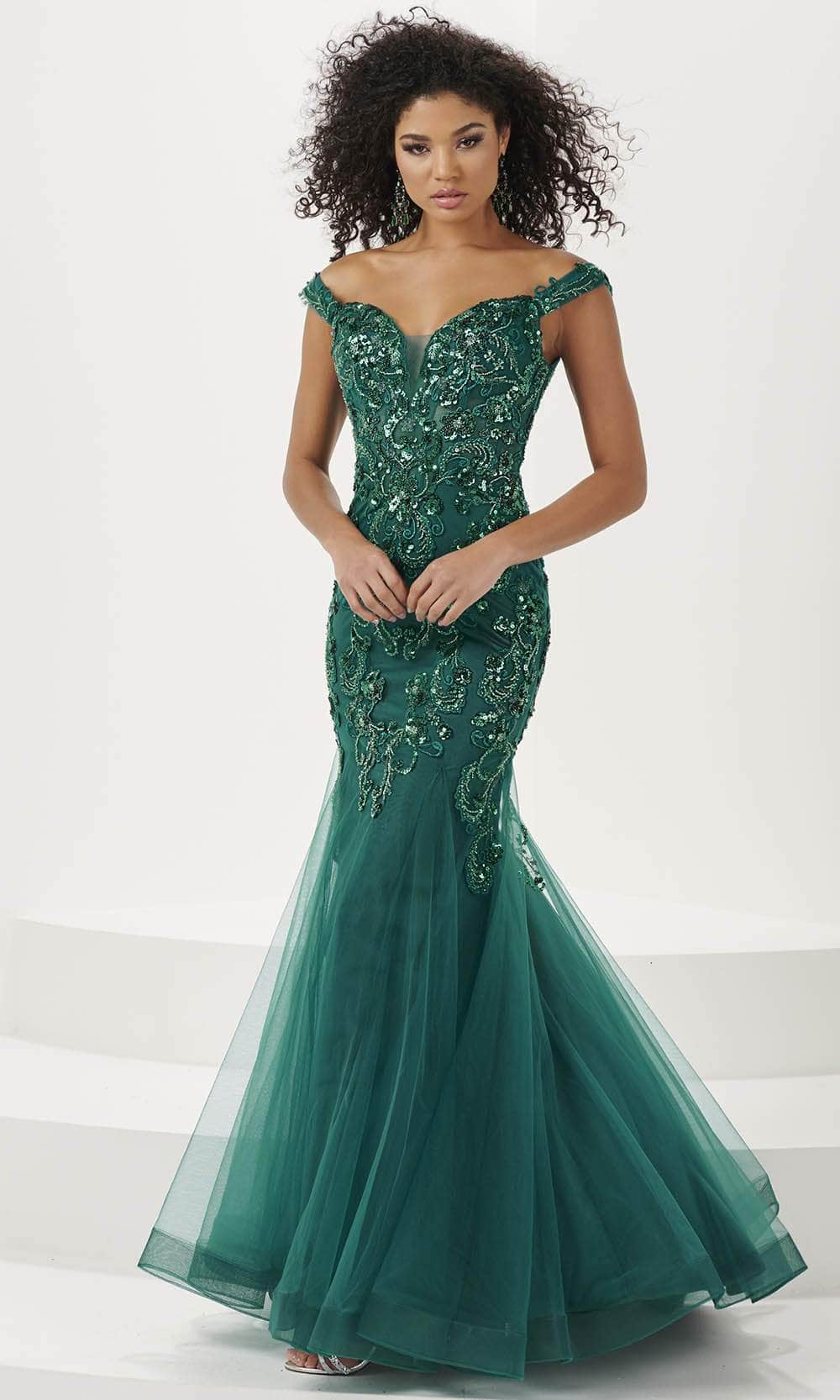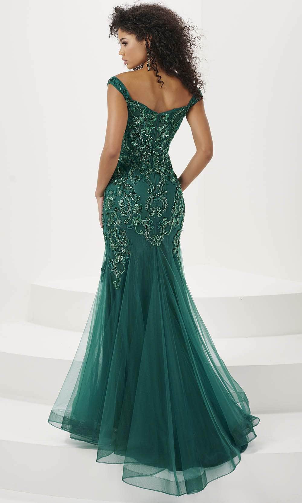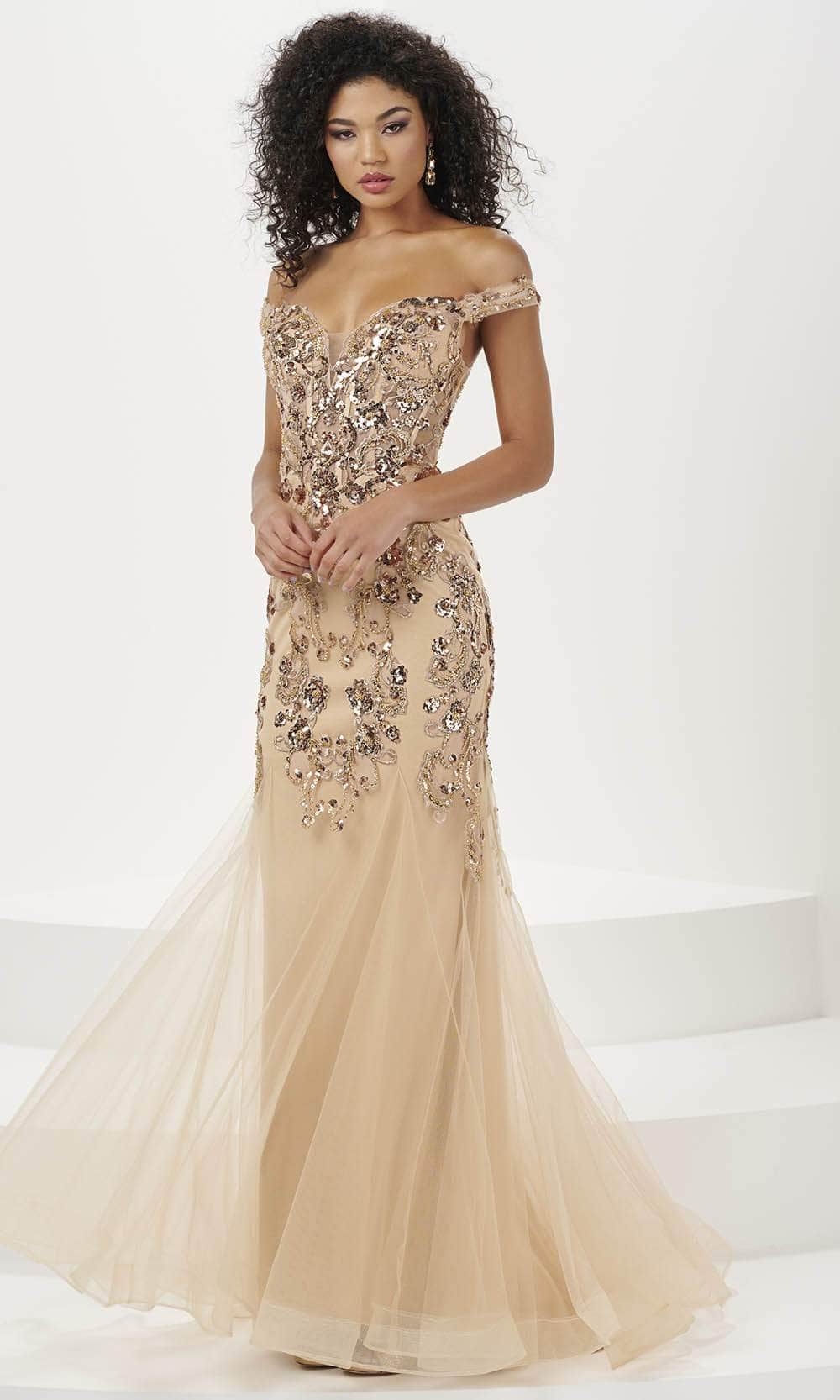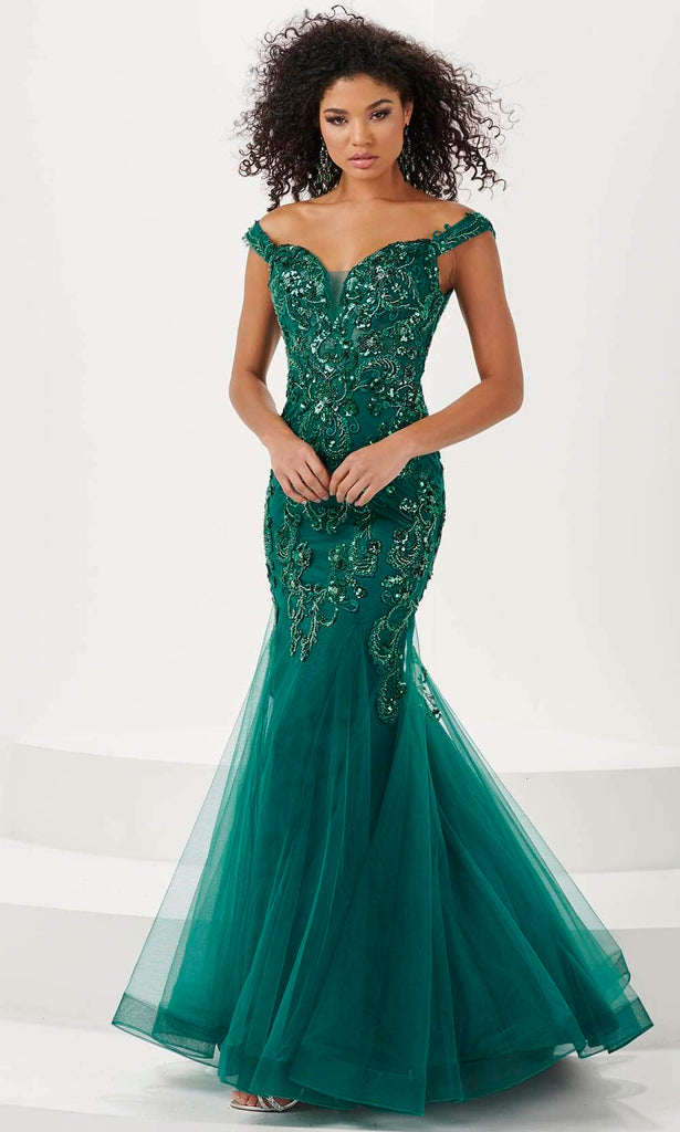 Elevate your special occasion to a celestial level with the enchanting Panoply 14185 creation. Offering a low-plunge sweetheart neckline graced by delicate spaghetti straps, this gown is all adorned with an intricate sequin design. This shimmering artistry continues its mesmerizing journey, cascading from the bodice to the gracefully fitted chiffon body, and then further extending onto the full mermaid skirt with a trailing train. Make a captivating impression in this exquisite Panoply 14185 masterpiece that becomes the epitome of sophistication and timeless allure. Models are wearing the Gold and Hunter Green colors.