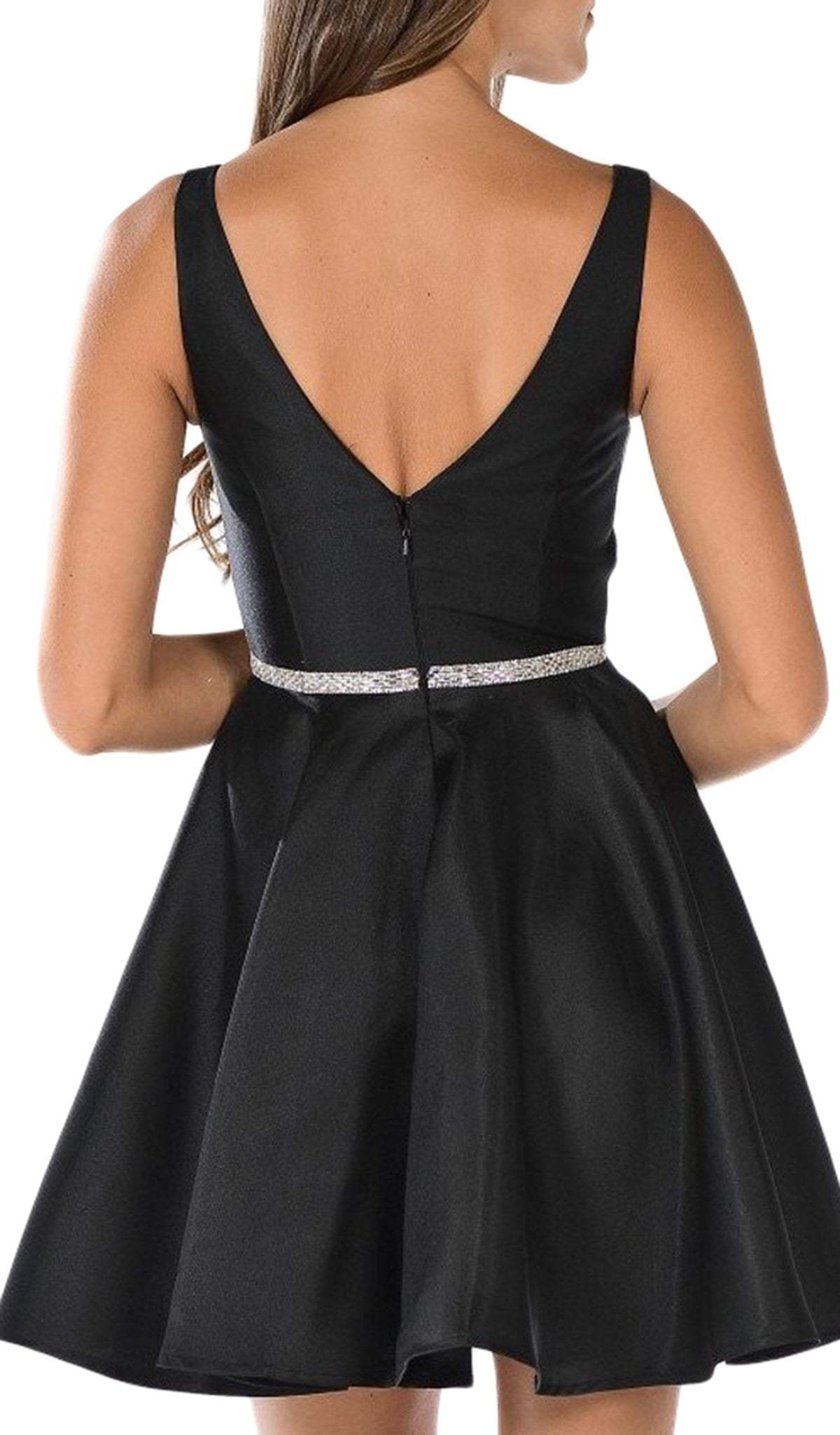 Promote attention-grabbing style in this stunning dress by Poly USA 7894. Features a sleeveless, deep V-neckline with sheer inset. The bodice is cinched in an embellished belt and flaunts a V-back with a zipper closure. The skirt flows in an A-line silhouette and runs at mid-thigh hem. This Poly USA creation is simply captivating!