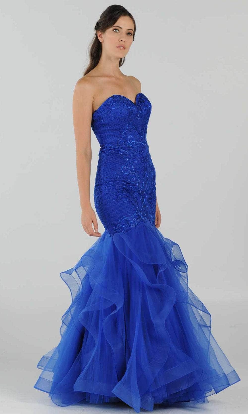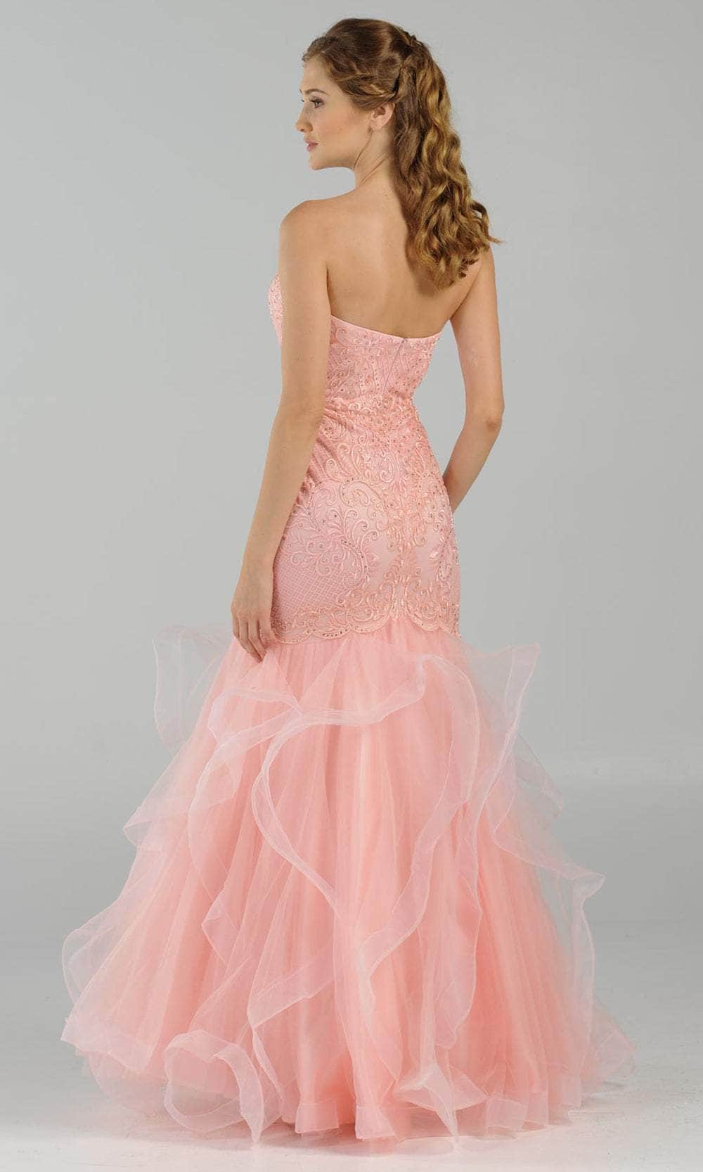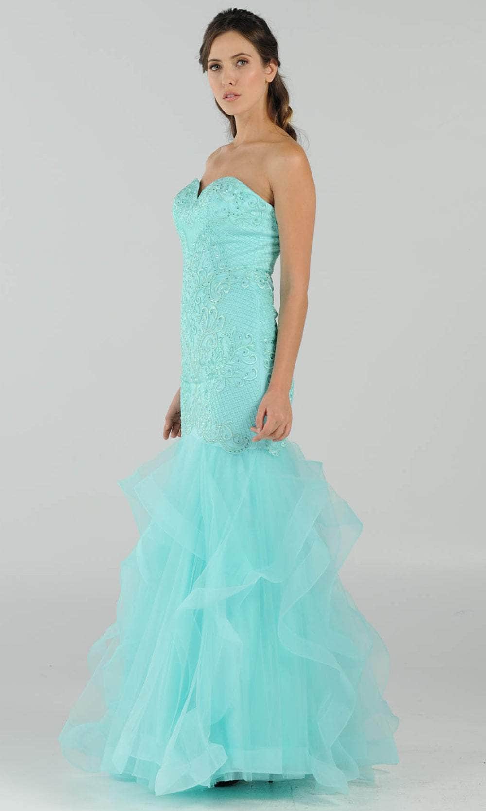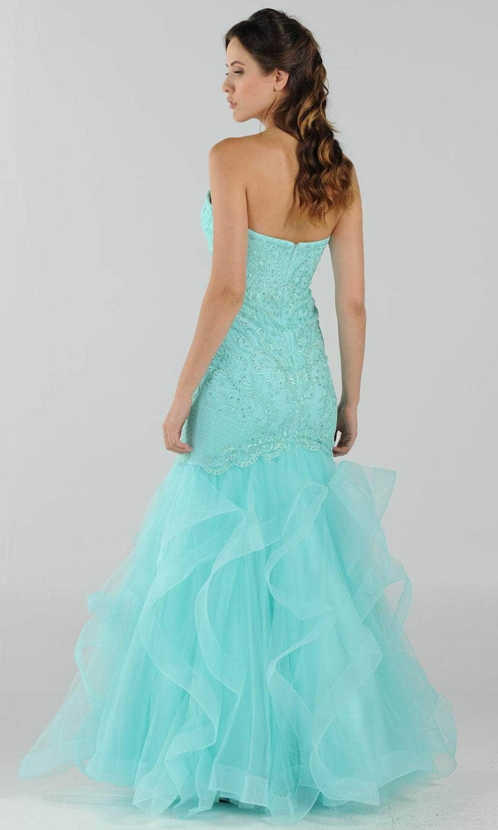 Make an impressive entrance in this creation from Poly USA 8198. This strapless design with its detailed embroidery and sparkling rhinestone adornment is truly breathtaking. The sweetheart neckline adds a touch of romance and accentuates your collarbones. It is kept together by a zipper closure at the mid-open back. The ruffled tiers with a horsehair hem create a dramatic mermaid skirt, which glides to the full length hemline. Bring on that commanding beauty in this Poly USA 8198 masterpiece. Models are wearing Blush, Aqua, Off White, Royal, and Red colors.