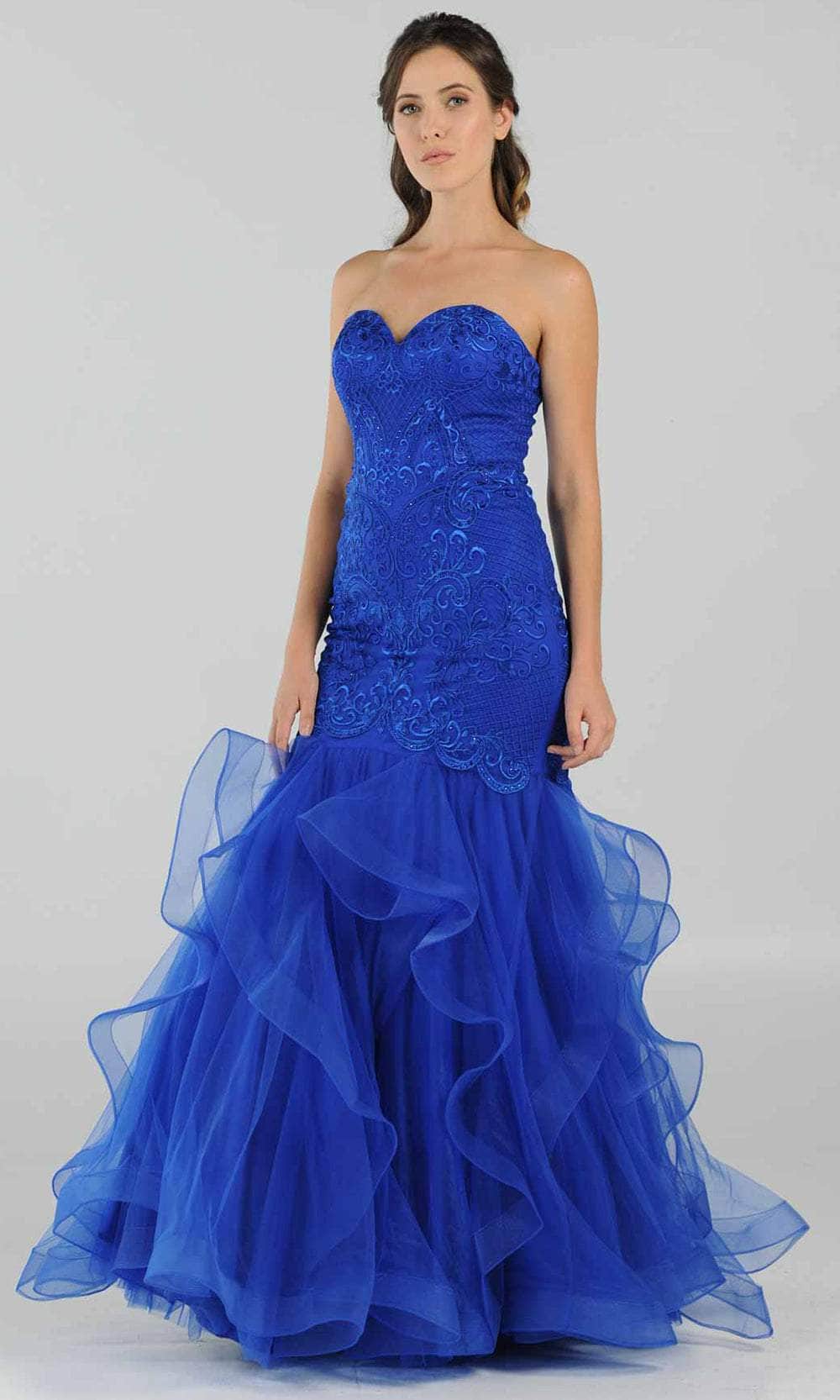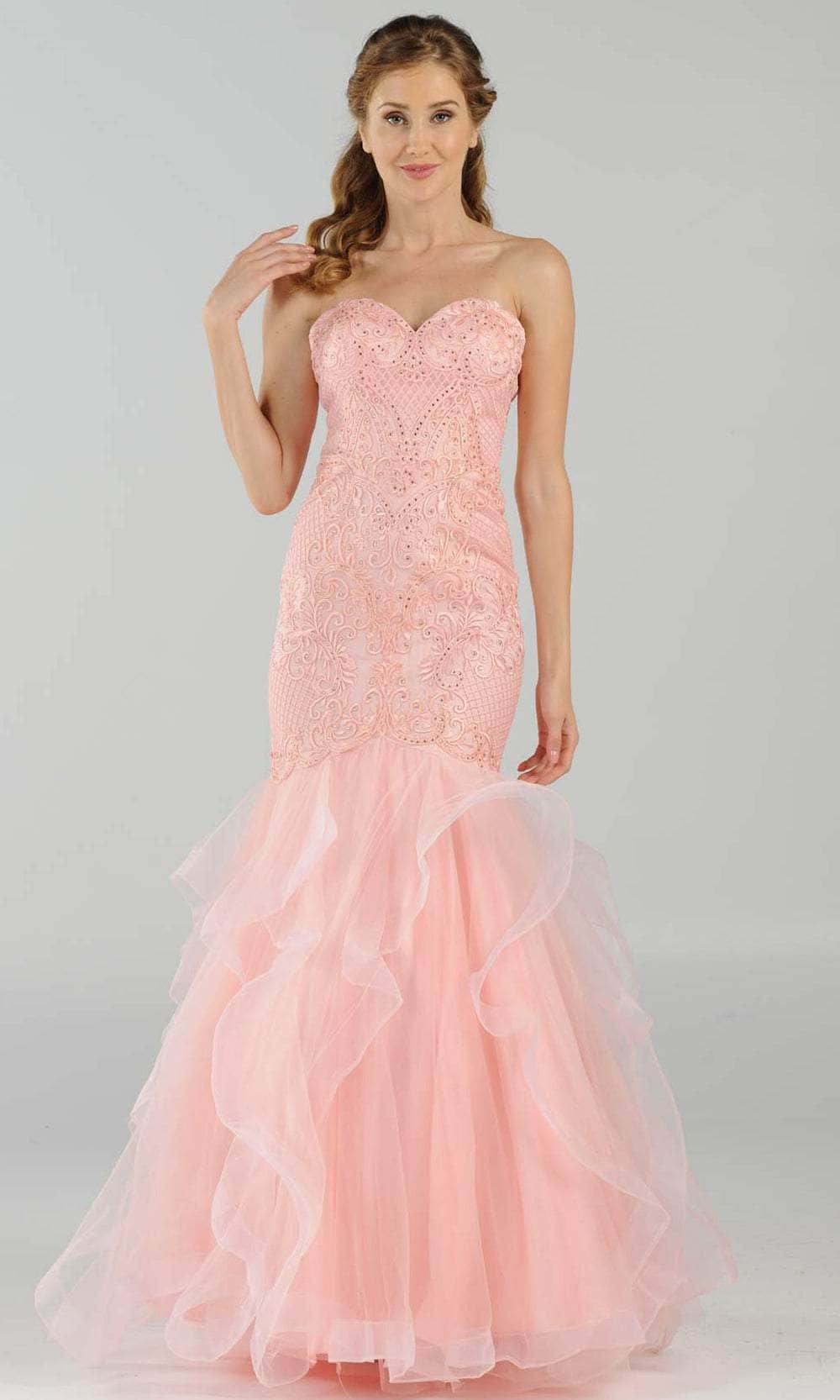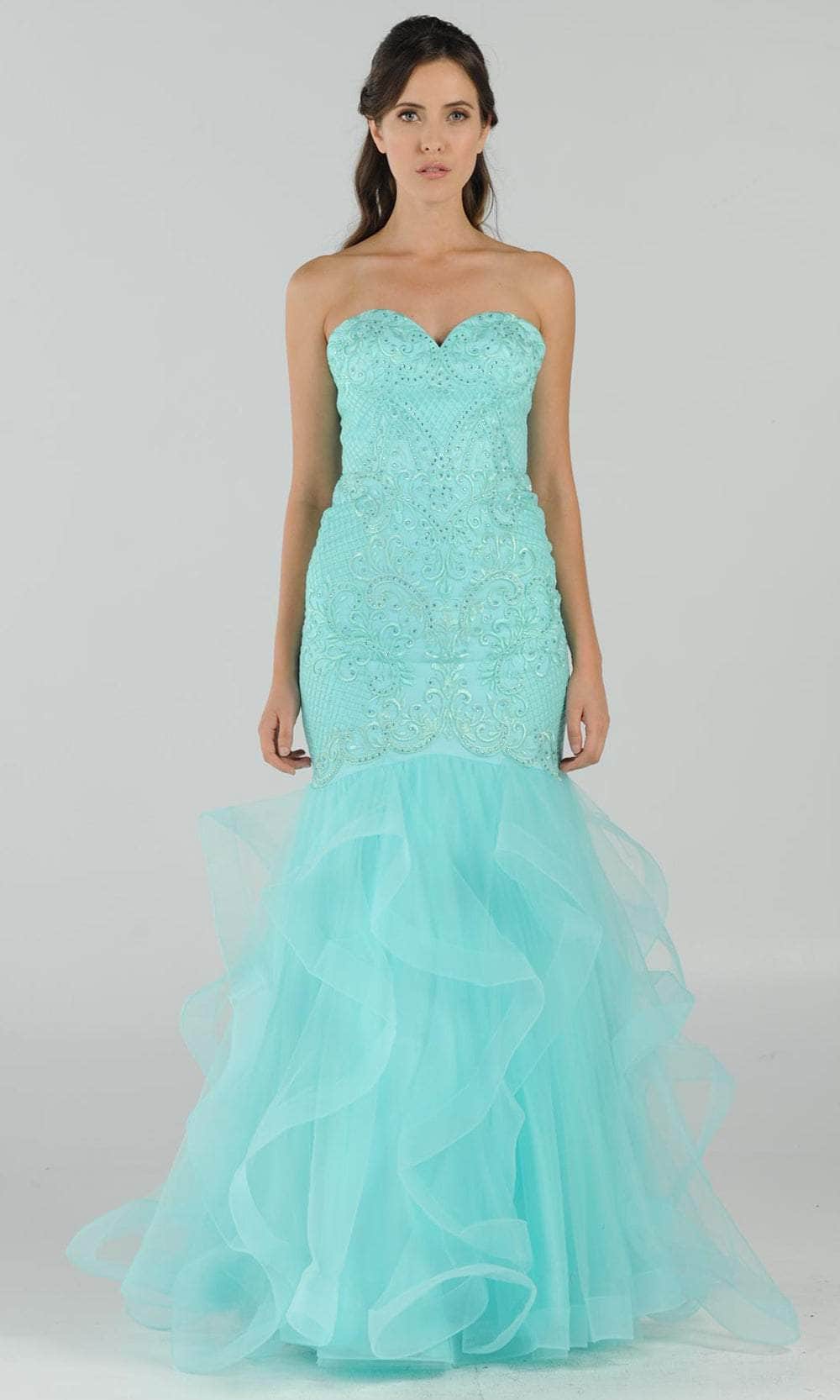 Make an impressive entrance in this creation from Poly USA 8198. This strapless design with its detailed embroidery and sparkling rhinestone adornment is truly breathtaking. The sweetheart neckline adds a touch of romance and accentuates your collarbones. It is kept together by a zipper closure at the mid-open back. The ruffled tiers with a horsehair hem create a dramatic mermaid skirt, which glides to the full length hemline. Bring on that commanding beauty in this Poly USA 8198 masterpiece. Models are wearing Blush, Aqua, Off White, Royal, and Red colors.