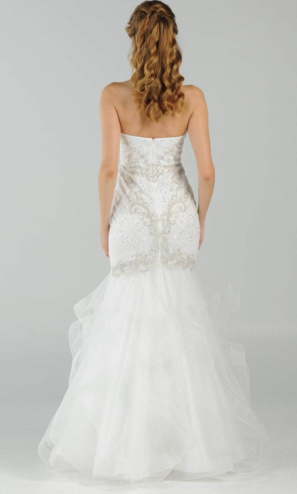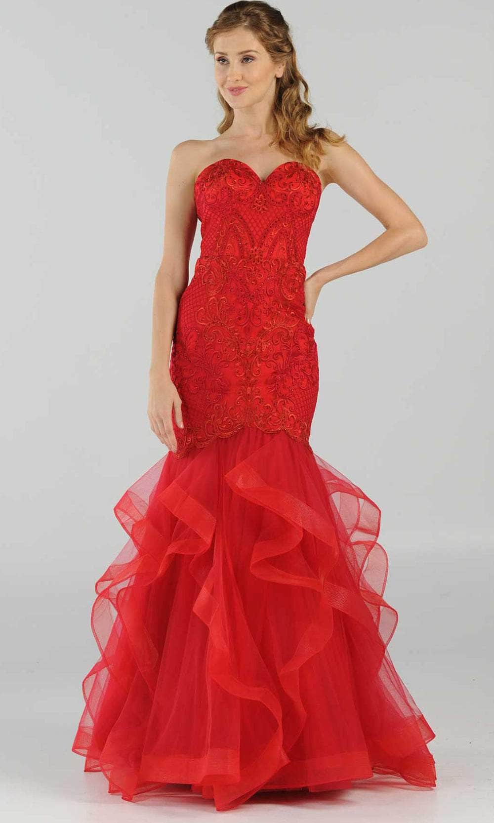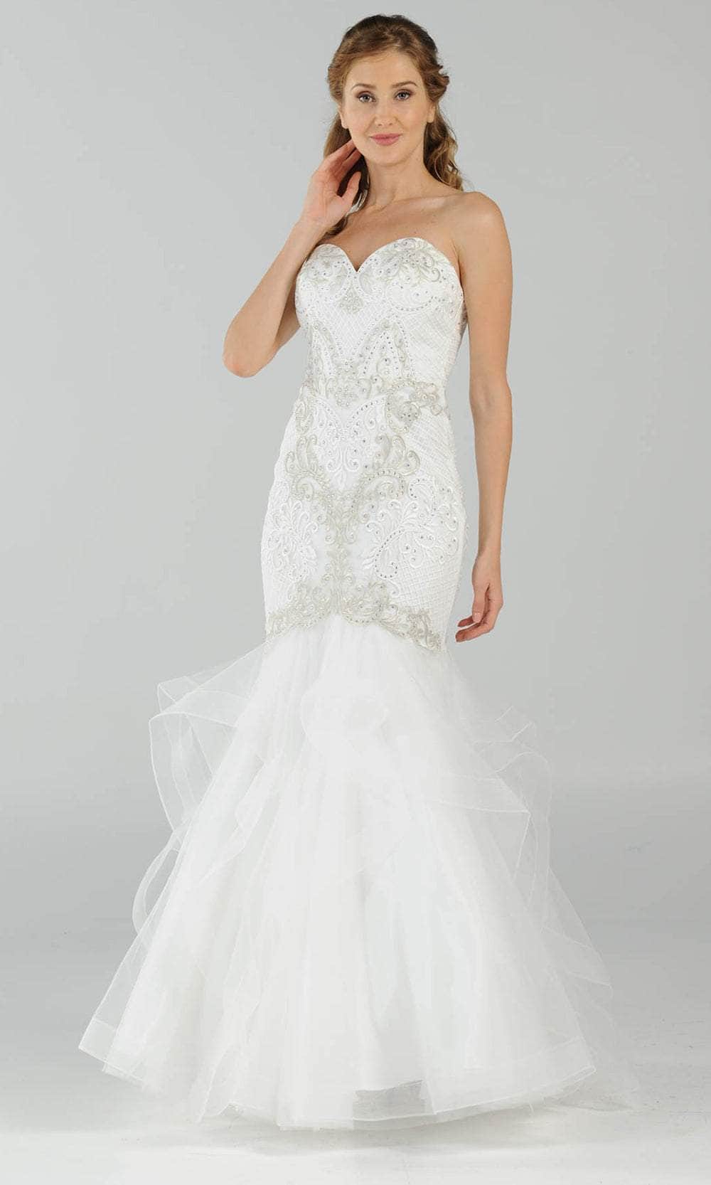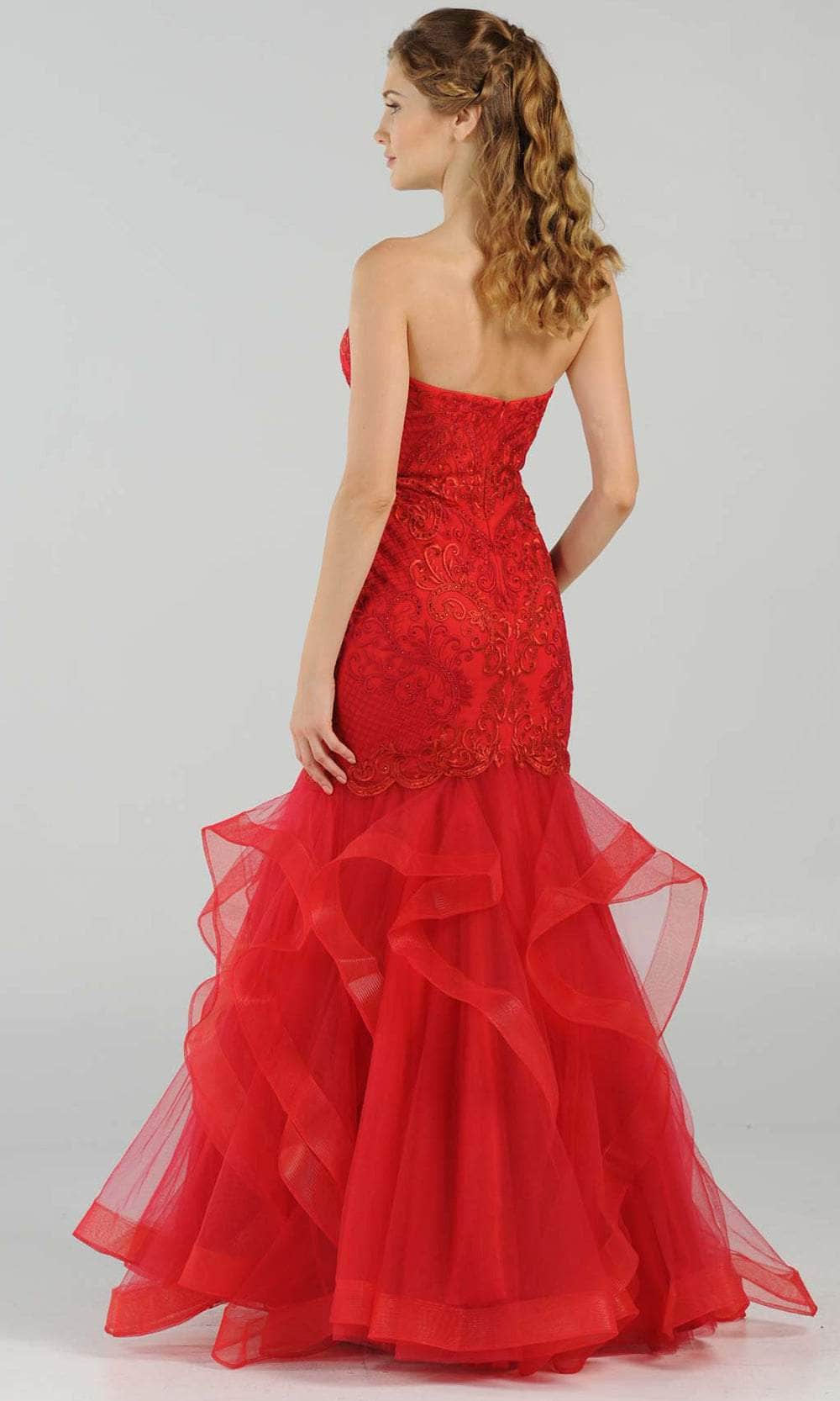 Make an impressive entrance in this creation from Poly USA 8198. This strapless design with its detailed embroidery and sparkling rhinestone adornment is truly breathtaking. The sweetheart neckline adds a touch of romance and accentuates your collarbones. It is kept together by a zipper closure at the mid-open back. The ruffled tiers with a horsehair hem create a dramatic mermaid skirt, which glides to the full length hemline. Bring on that commanding beauty in this Poly USA 8198 masterpiece. Models are wearing Blush, Aqua, Off White, Royal, and Red colors.