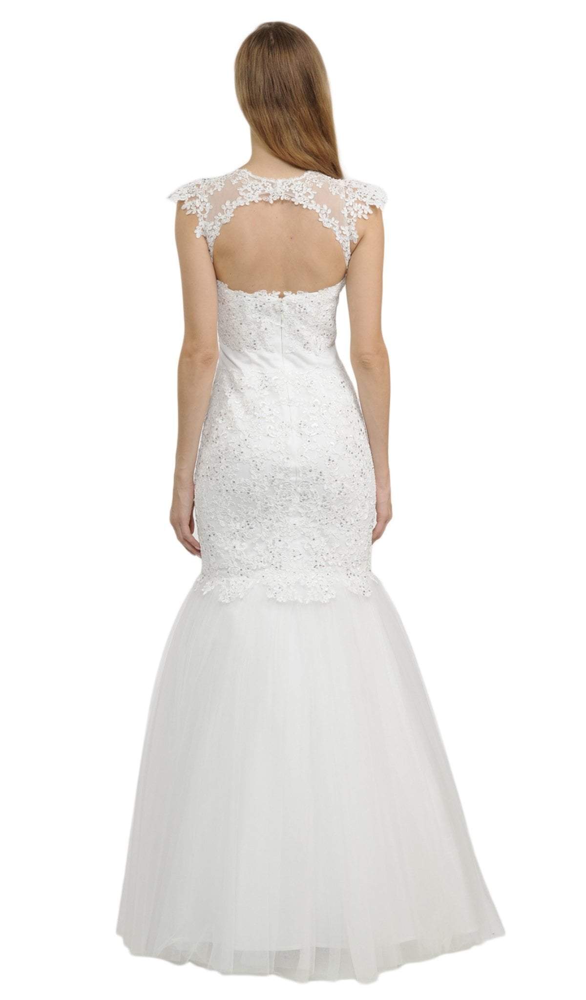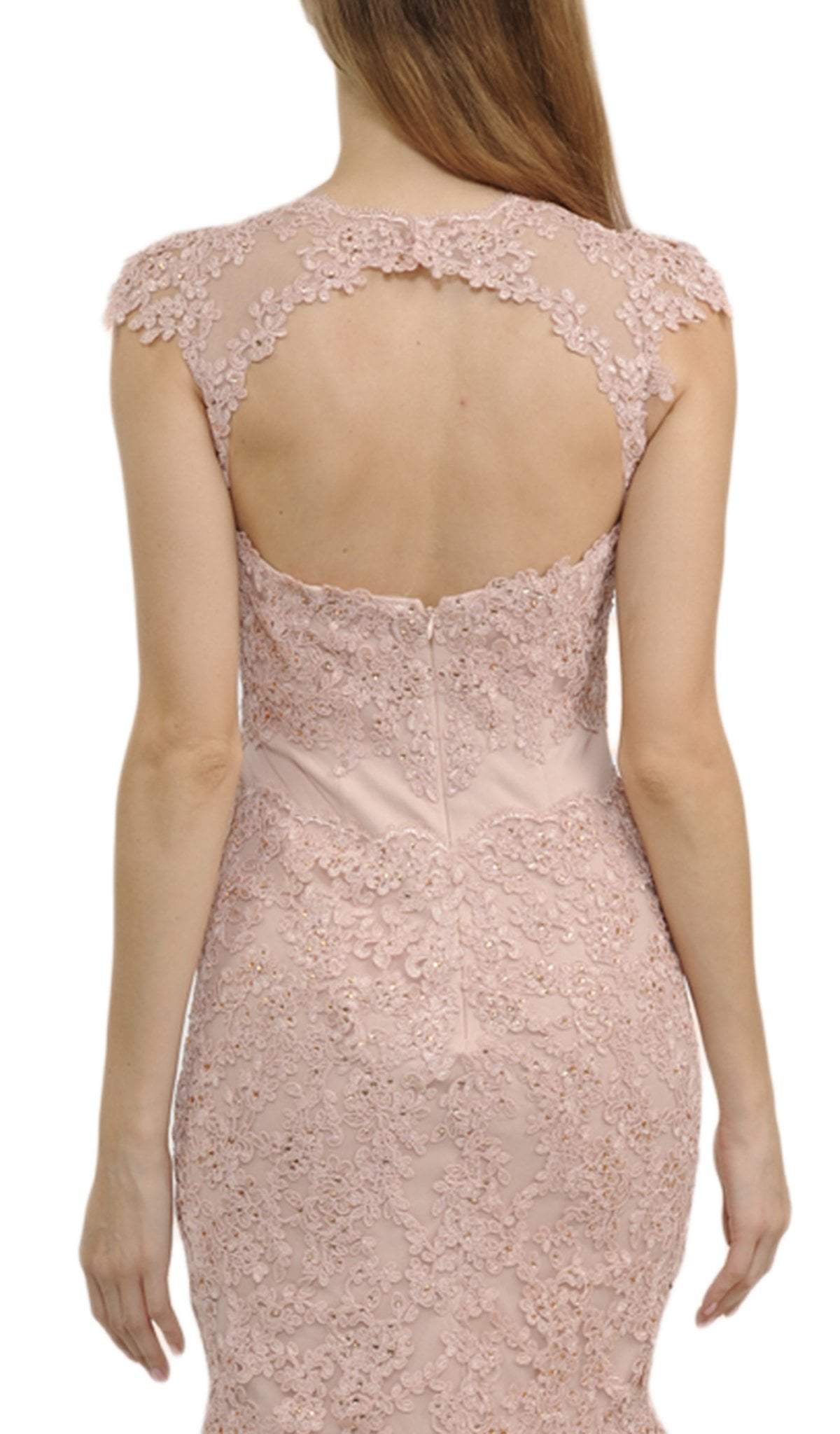 | Details: | Lace Appliques, Cap Sleeves, Rhinestones, Layered Mesh, Inverted U Cutout Back, Back Zipper Closure, Full Length Hem |