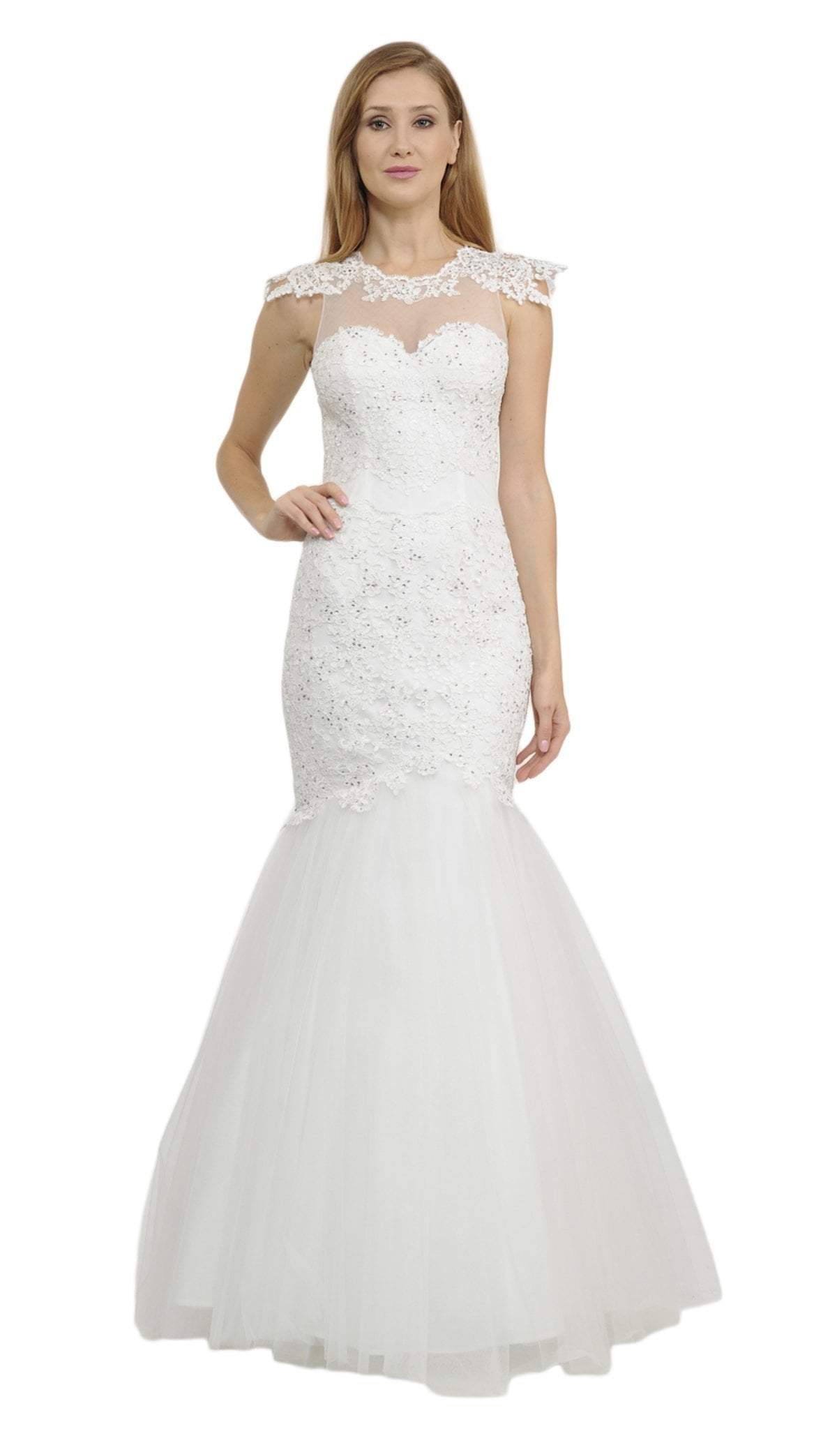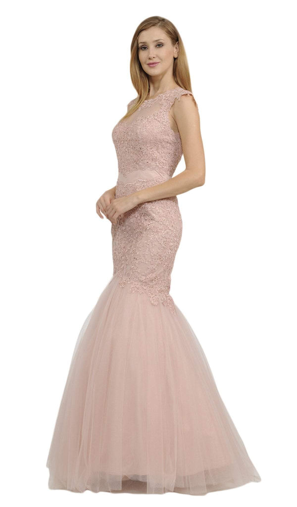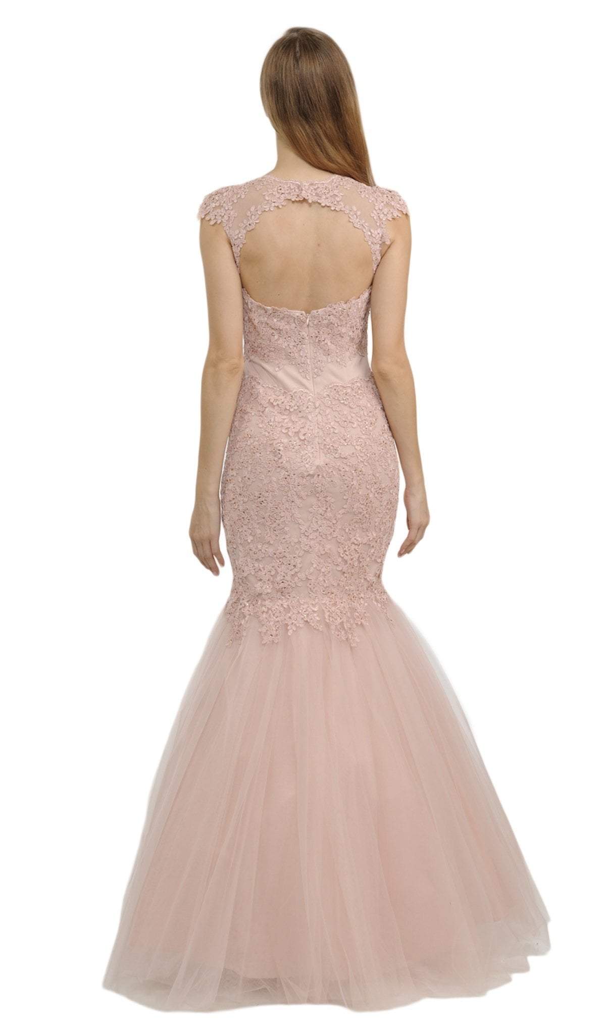 Look like an ethereal vision when you saunter with elegant flair in this exquisite Poly USA 8226 creation. Adorned with lace appliques and shimmering with faceted stones, this beauty flaunts a jewel illusion over a sweetheart neckline while being framed with cap sleeves. Designed with a sophisticated inverted-u back and a fan-shaped cutout, the full-length mermaid skirt fascinatingly flares down to touch the floor. Revel on royal elan in this sparkling Poly USA masterpiece. Models are wearing the Mauve and Off White colors.