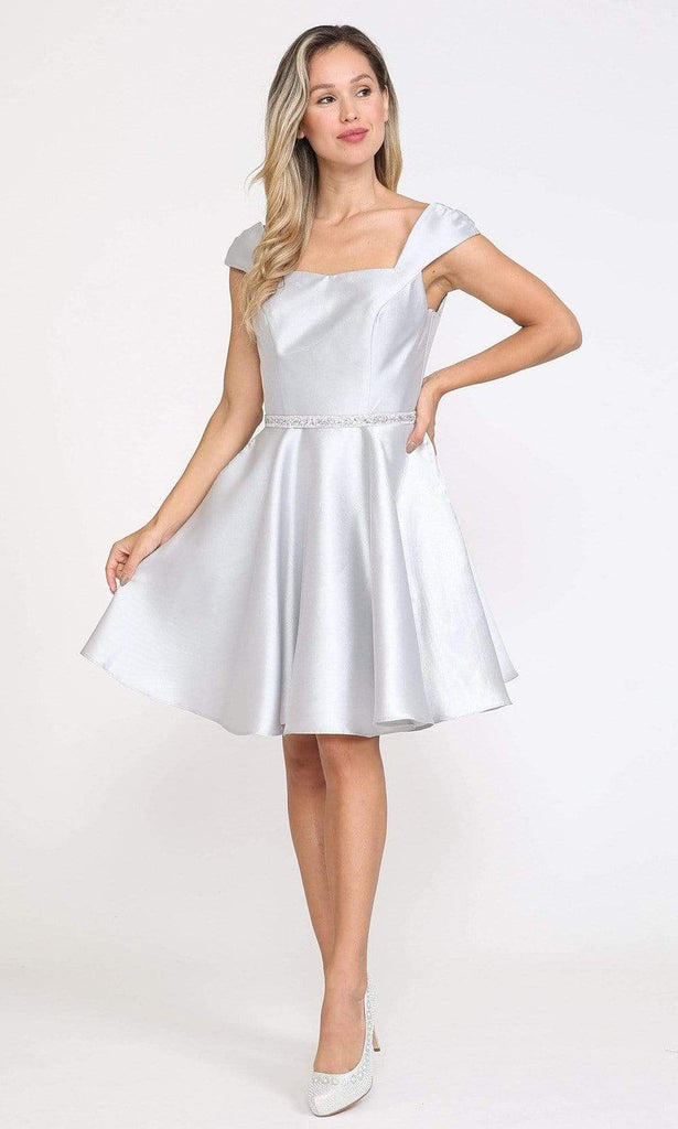Look and feel like a dream in this mesmerizingly adorned Poly USA 8416 creation. Framed with cap sleeves on a sleek Mikado silhouette, this dress features a square neckline and a lace up back. A modesty panel can be optionally attached to the ensemble. Crowned with a bejeweled waist, the skirt flutters into a short hemline. Beam with pride when you wear this Poly USA masterpiece.