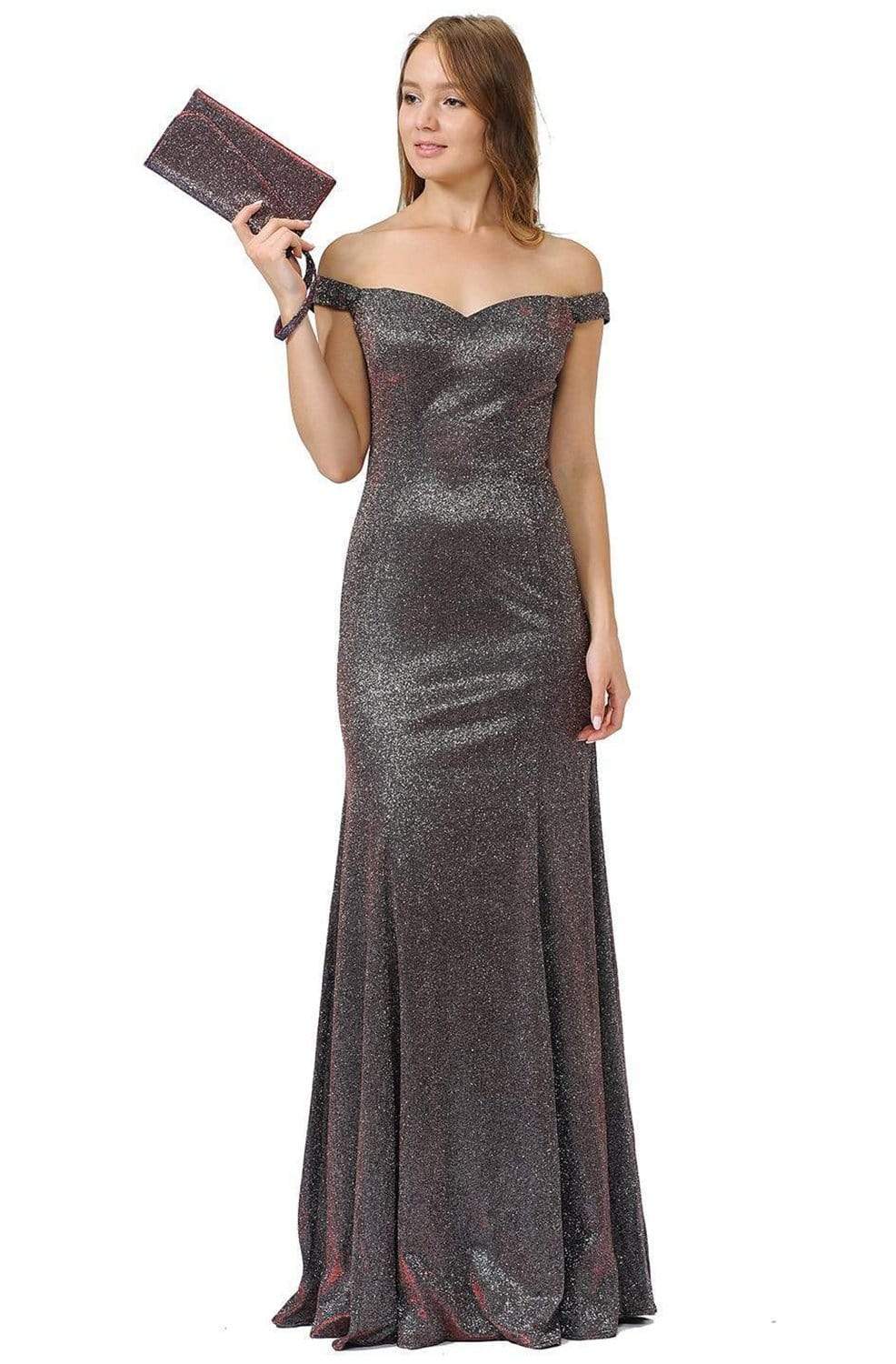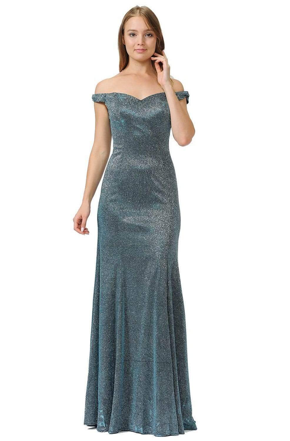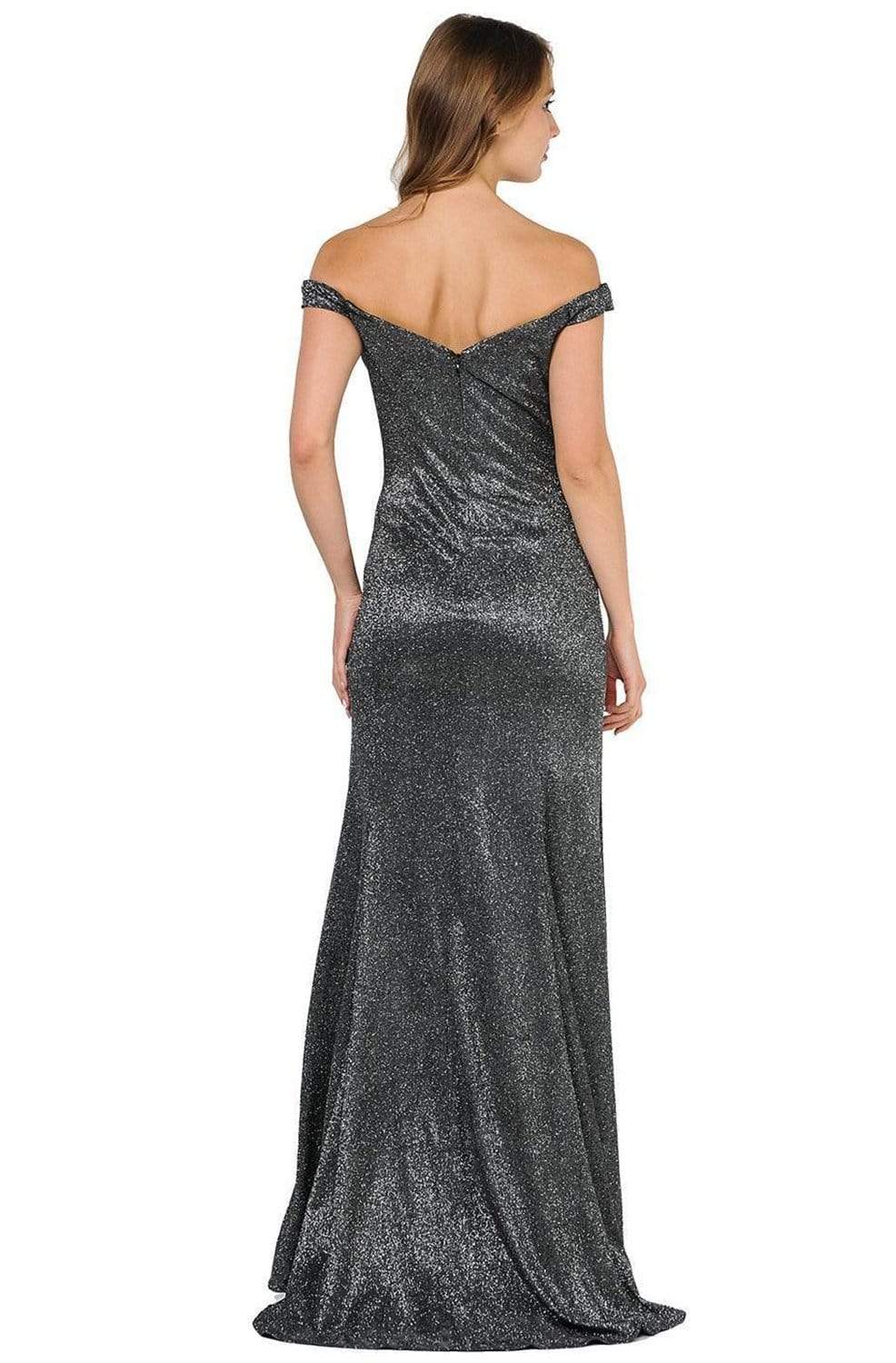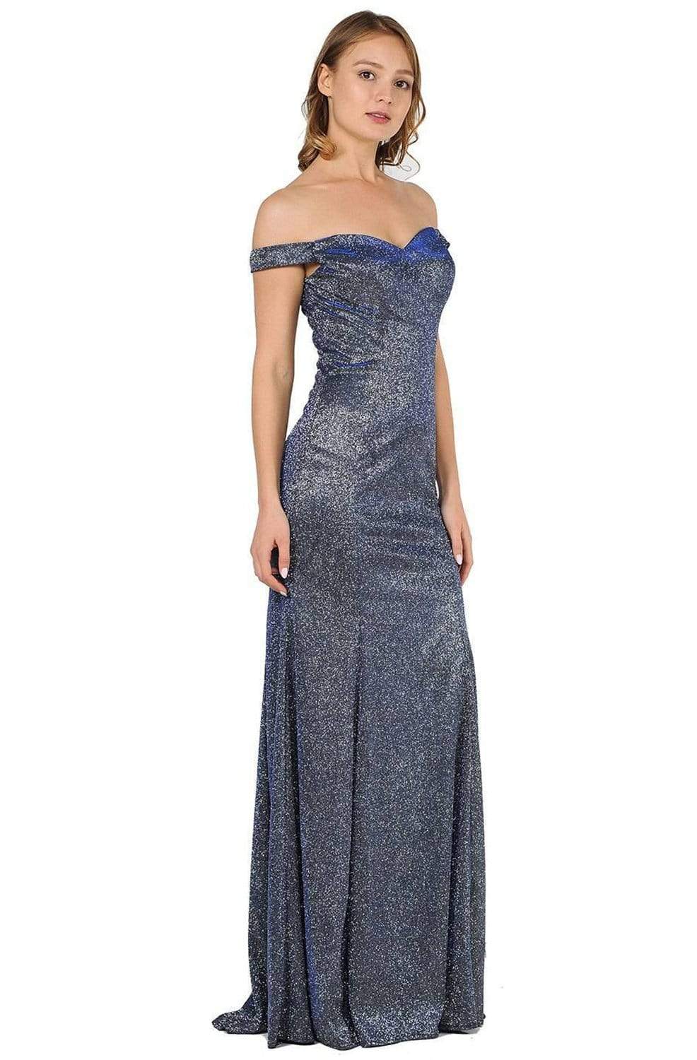 Look instagram worthy in this stunning Poly USA 8482 evening gown. This metallic glitter features a lovely off-shoulder sweetheart bodice, complemented with a wide mid-open V back. Fitted though the hips, the skirt flares gorgeously to the floor, highlighting a trumpet silhouette, completed with a sweep train. Make it your moment to stand out wearing this Poly USA creation.
