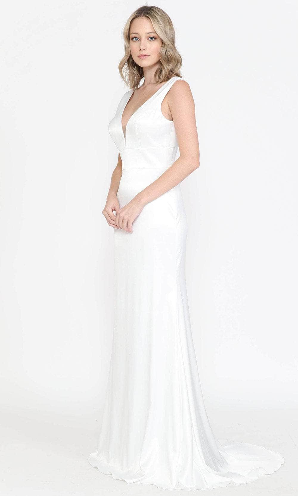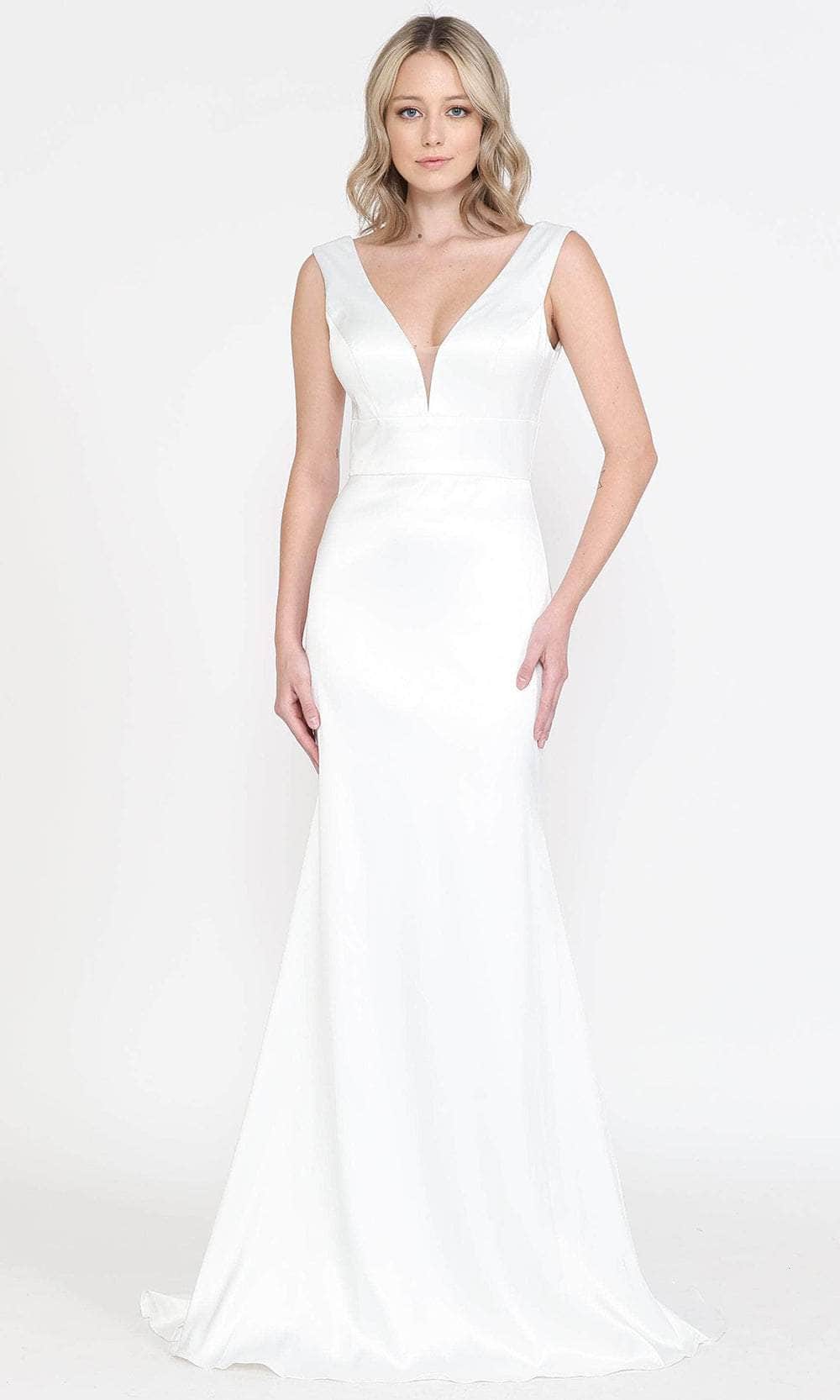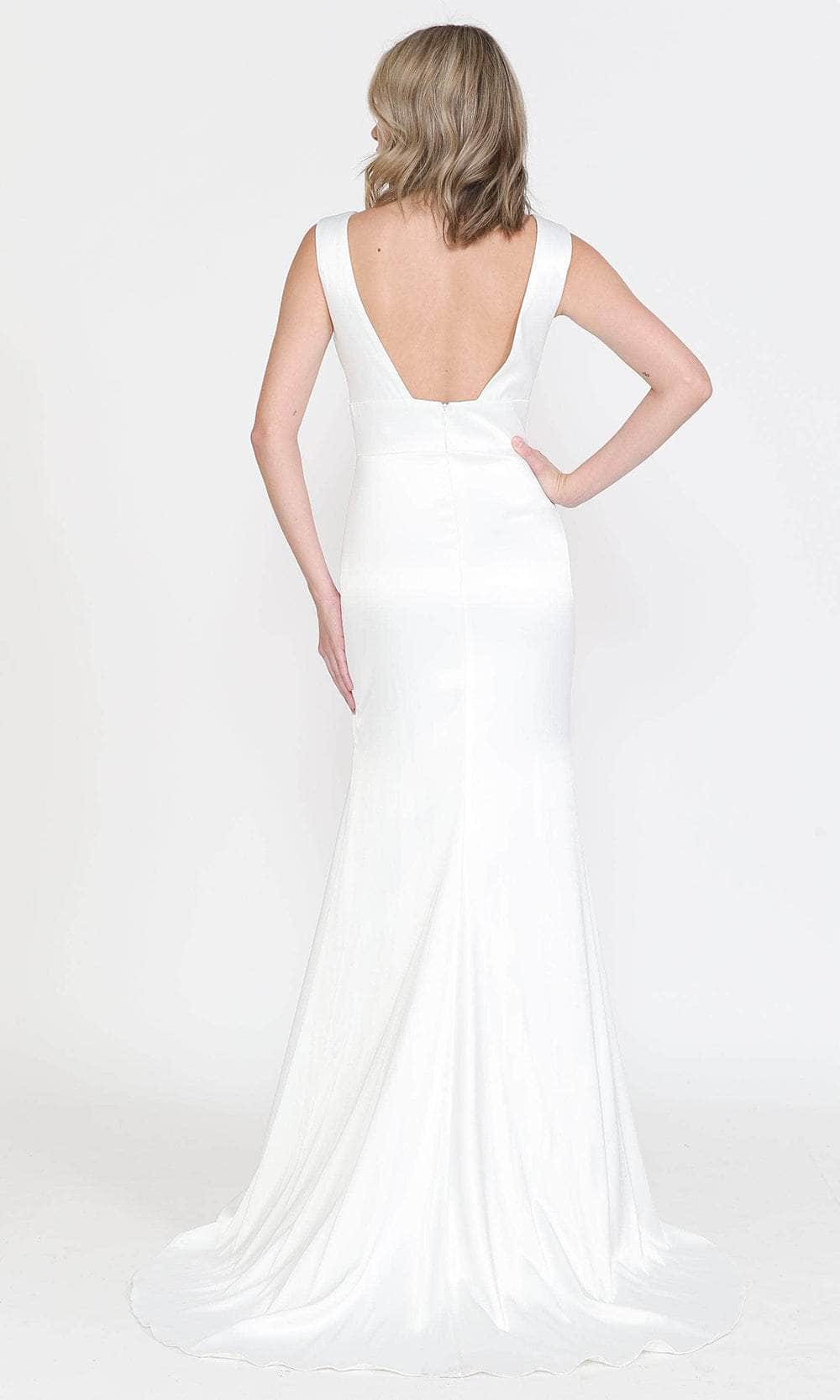 Exude timeless elegance in this Poly USA 8502 creation. Gorgeously sculpted in sleek satin, this beauty revels with a lovely deep V-neckline accented with a sheer panel and an open back that is secured with a concealed zipper closure. From the empire waistline, the skirt flares into a mermaid silhouette that ends beautifully with a court train. Walk down the aisle like a vision in this Poly USA 8502 masterpiece. Model is wearing Off-White color.